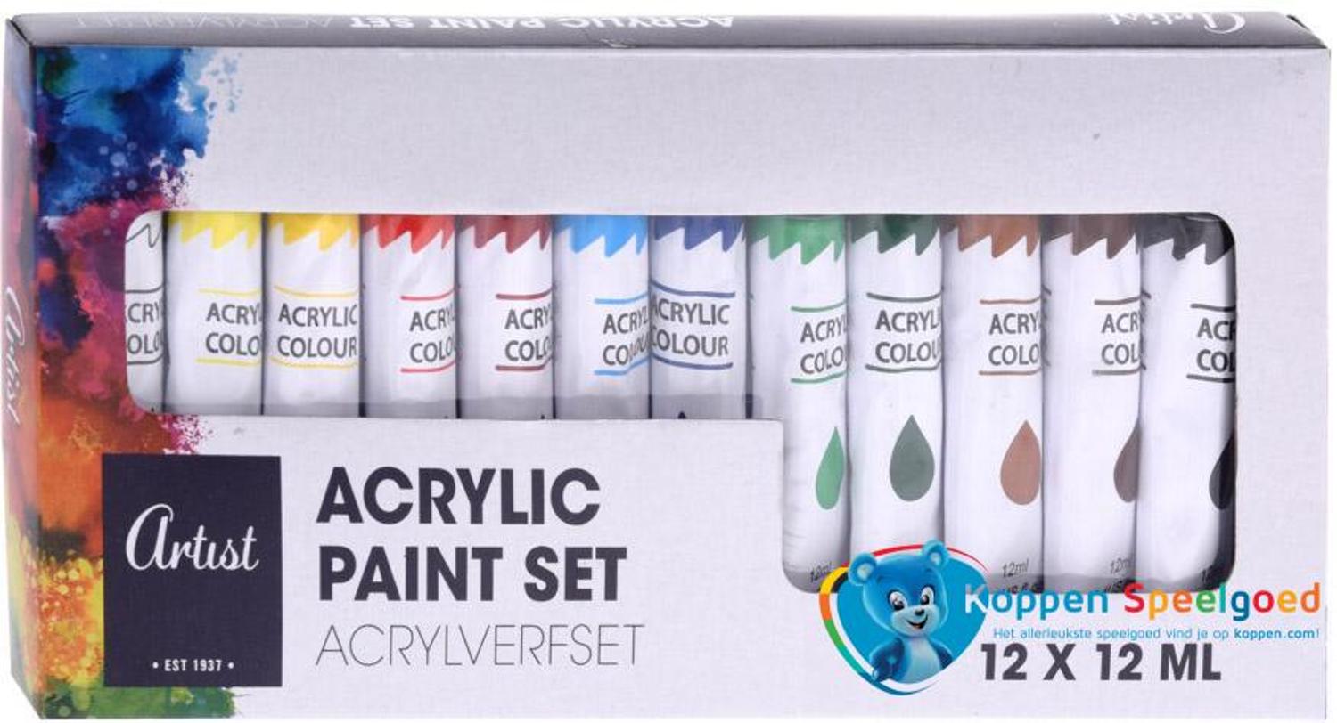 Doos met 12 tubes mooie kwaliteit acrylverf in verschillende kleuren. Iedere tube bevat 12 ml verf.