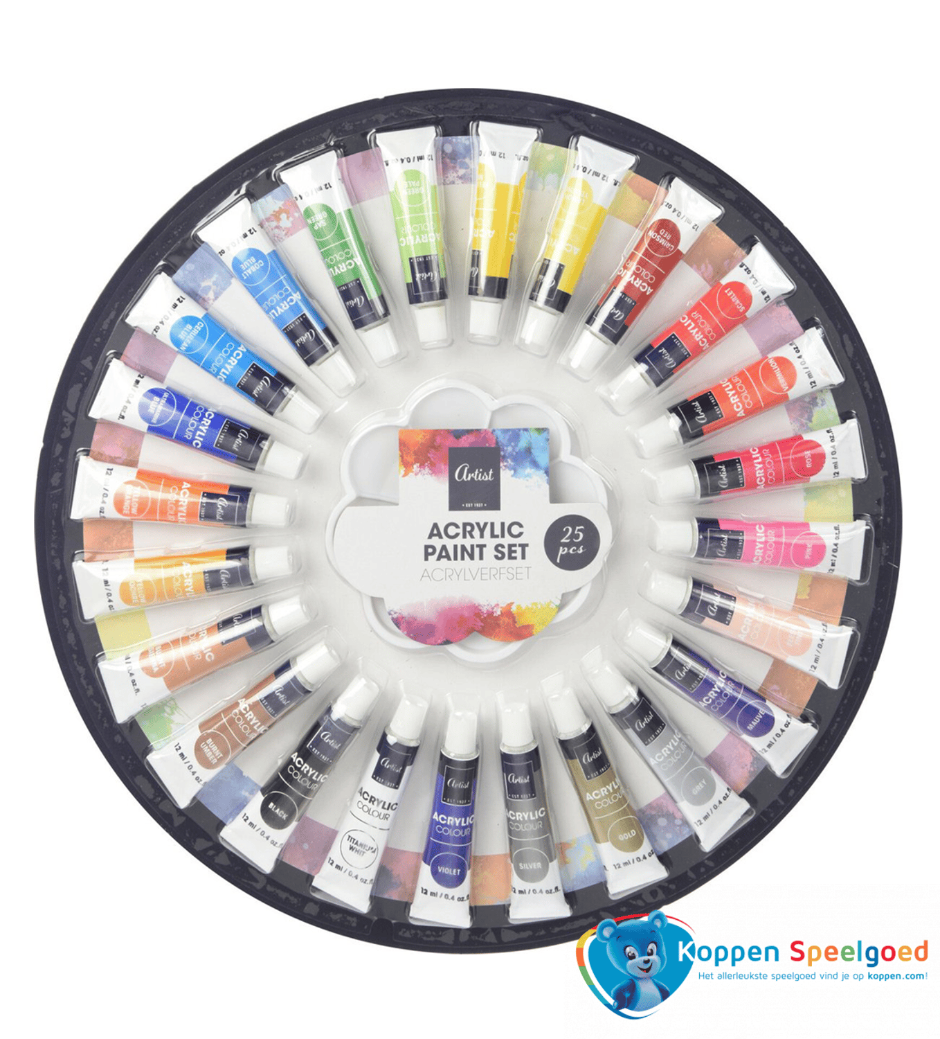 Het pakket bevat 25 verschillende acrylverven en een palet. Geweldige set voor zowel een beginner als een meer ervaren schilder.