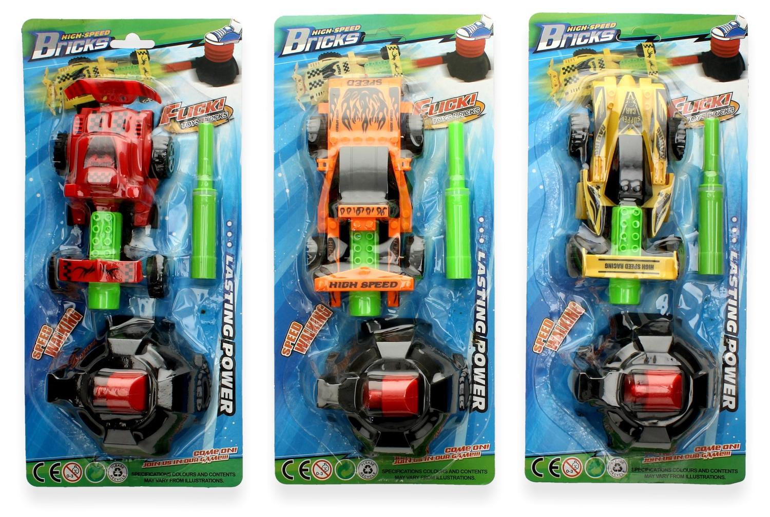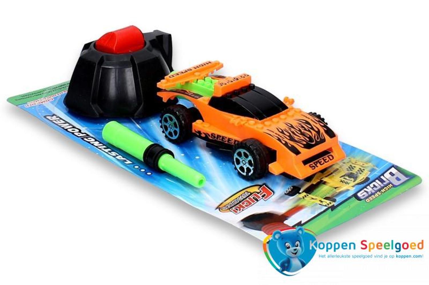 Afschiet auto op kaart. Zet de afschieter in elkaar en druk de auto op het uiteinde. Ga vervolgens op de afschieter staan en hij schiet weg.