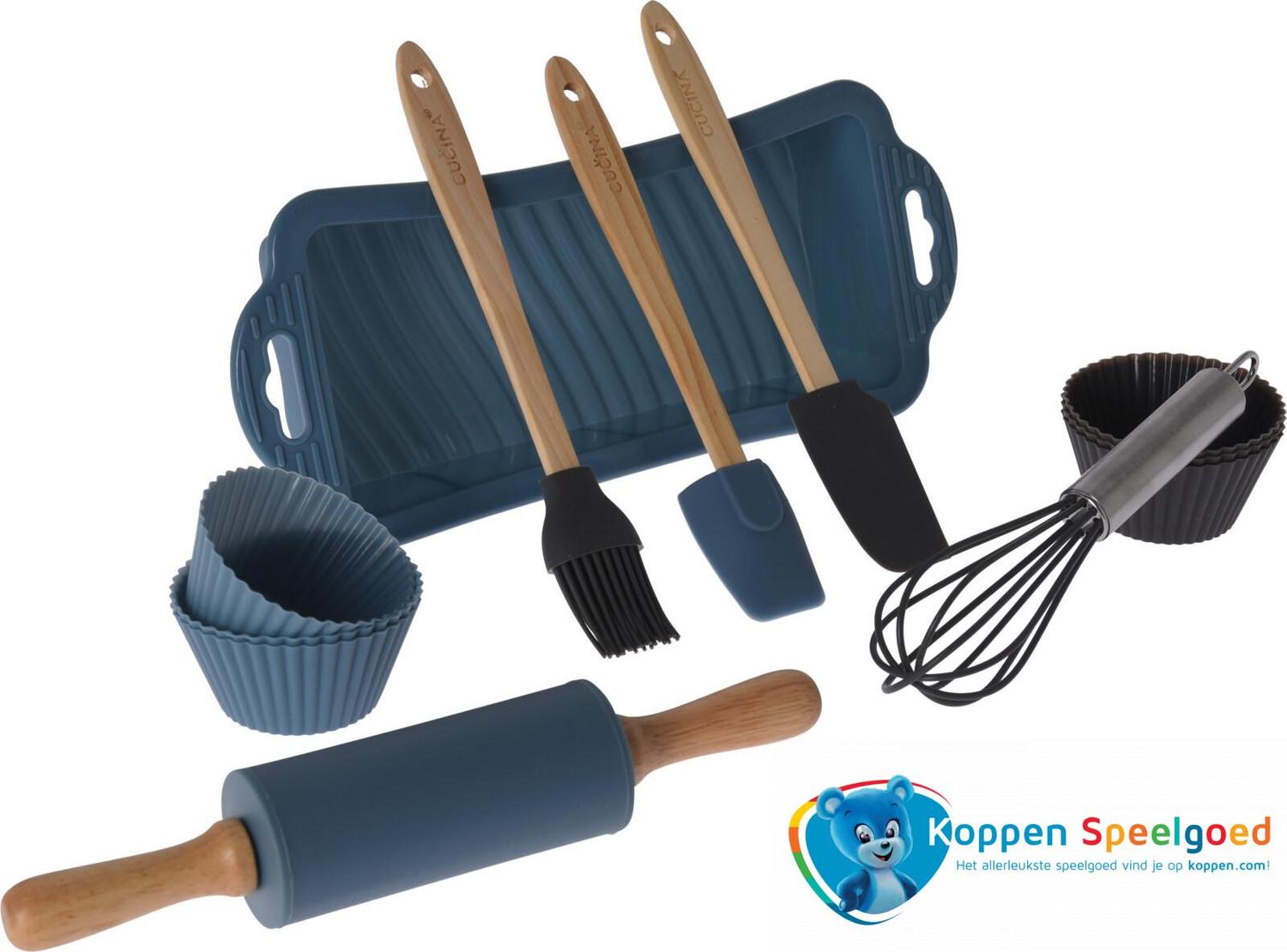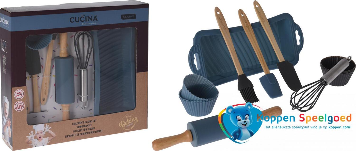 Bakset voor kinderen, 12 delig met o.a. spatels, kwast, een siliconen bakvorm, deegroller, cupcakevormpjes en een garde. De bakvorm kan echt de oven in, tot maximaal 200 graden C.