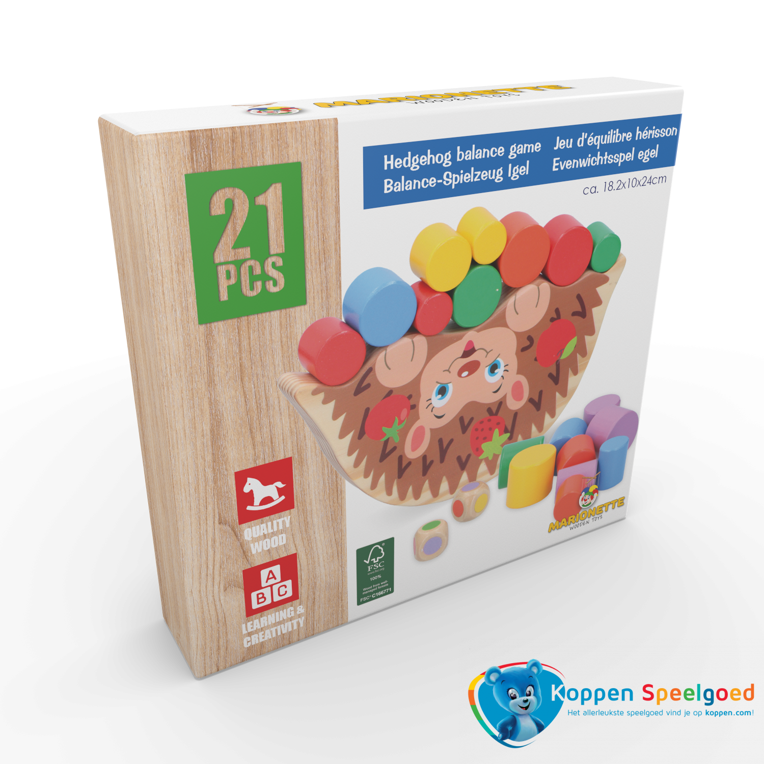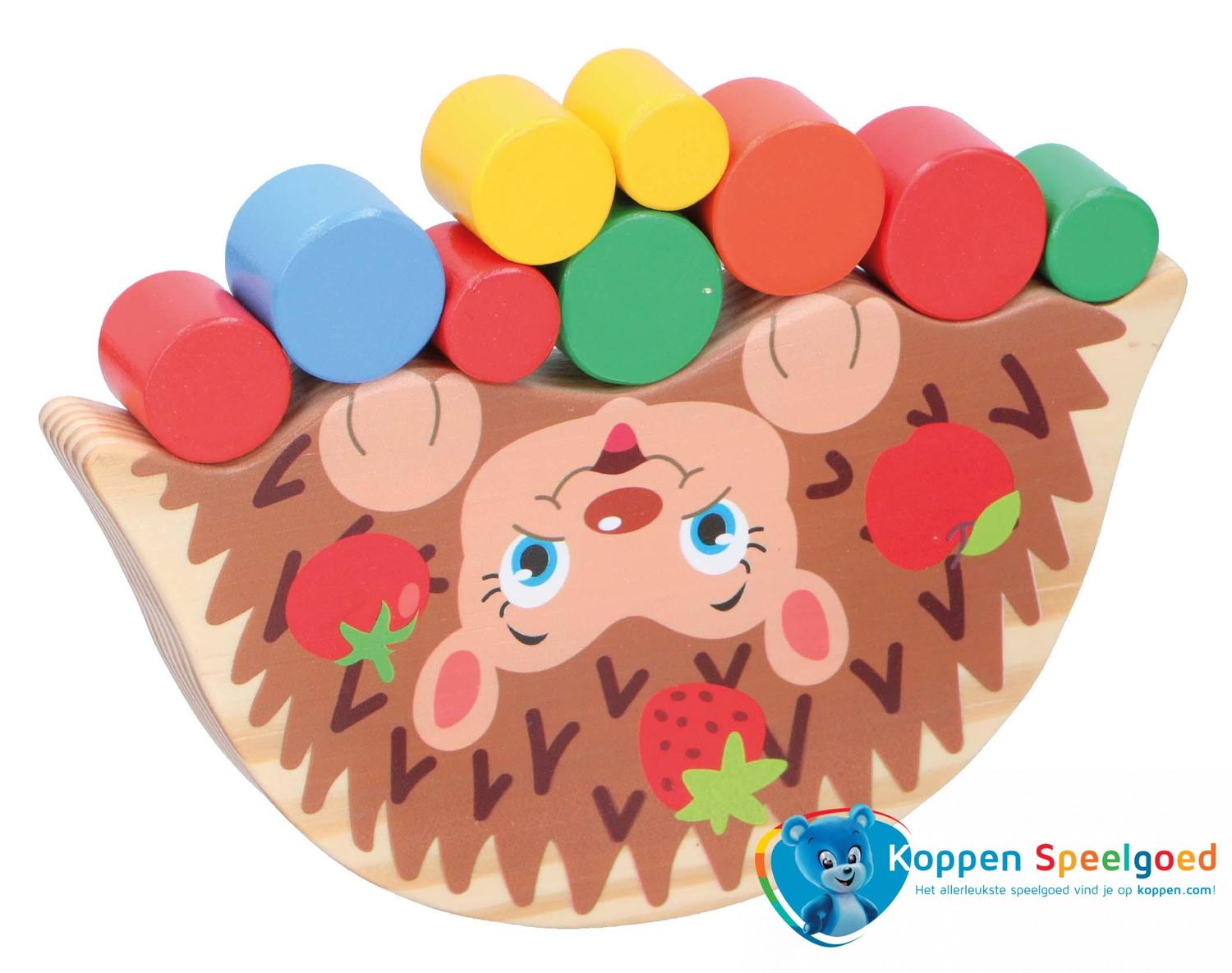 Houten balansspel in de vorm van een egel. Probeer zoveel mogelijk cilinders te stapelen en houd de egel in balans. Mooi speelplezier, duurzaam van FSC-hout.