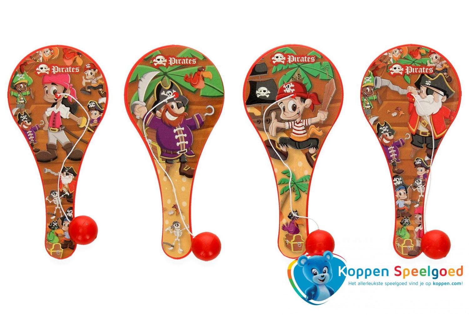 Batje balletje in piraten thema. Aan dit batje zit een balletje met een elastiekje. Zo raak je het balletje niet kwijt. Hoe lang kan jij het balletje hoog houden?