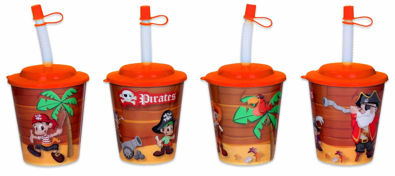 Beker met deksel en rietje, piraat. Deze set bestaat uit een beker, deksel en een rietje. De inhoud van de beker is 240 ml. Leuk voor bij feestjes.