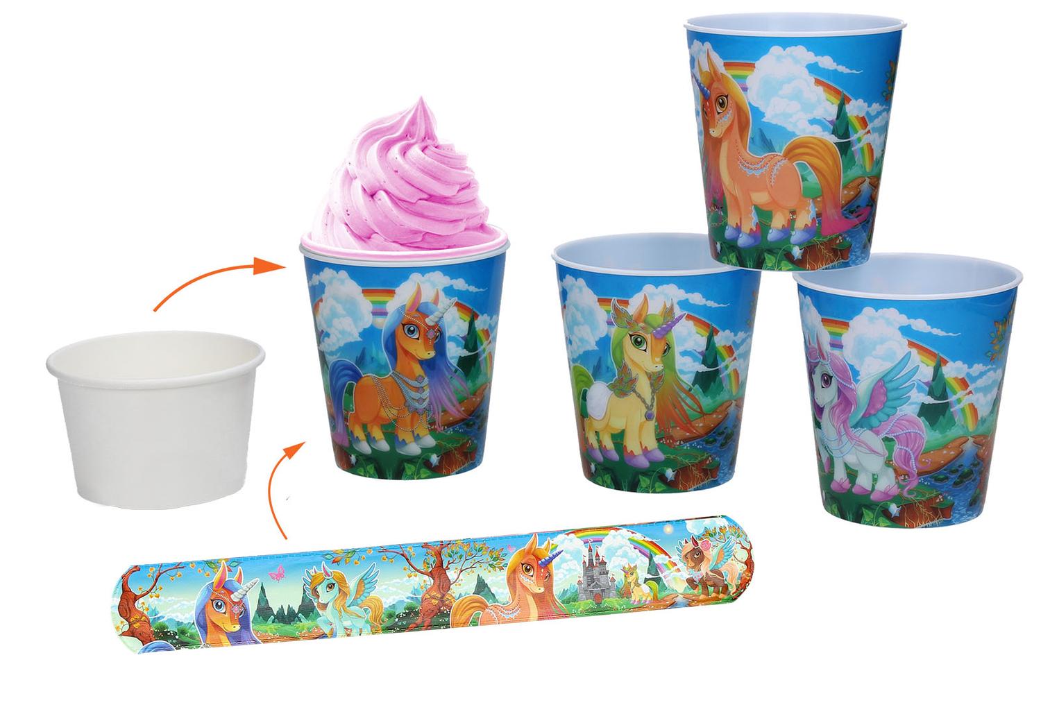 De bekerset bestaat uit een beker, een binnenbeker en een klaparmband in het thema van eenhoorns. De beker heeft een inhoud van 240 ml.