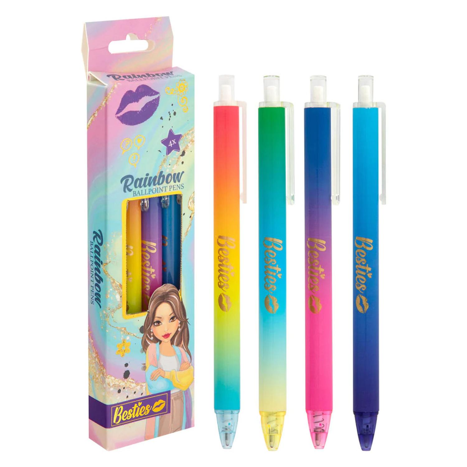 Set met 4 regenboogkleurige Besties balpennen. De pennen hebben het Besties-logo en een unieke, kleurrijke look. De pennen schrijven blauw.
