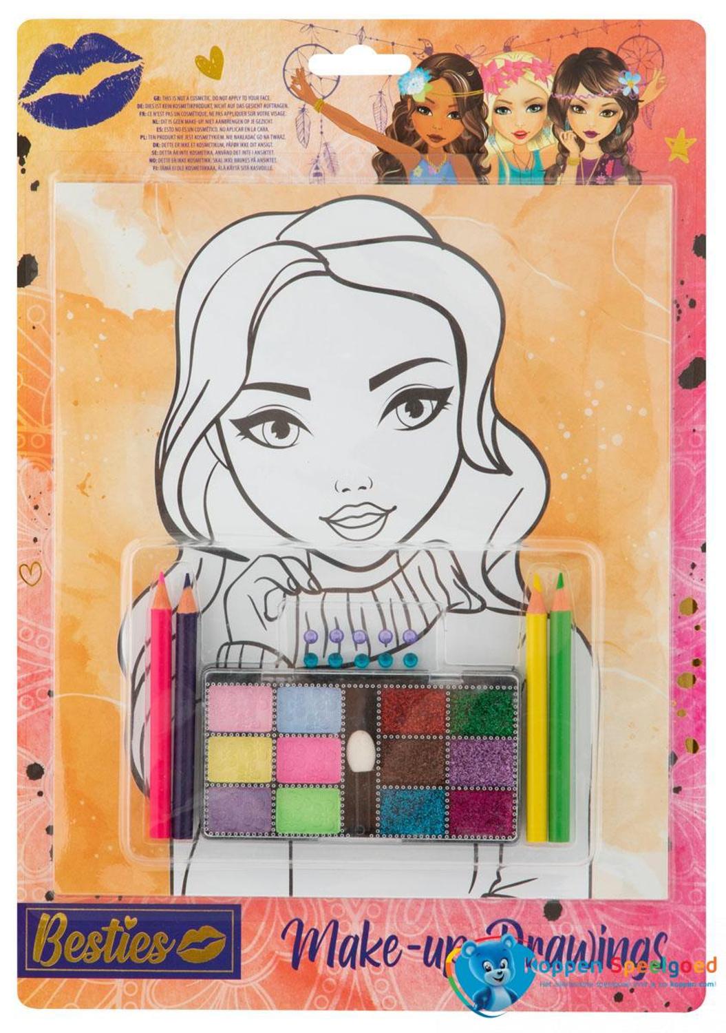 Besties maak je eigen make-up tekening met 4 protretsjablonen als kleurplaat, potloden, make-up-achtige poeders en kleurstof en glimmers en plakdiamantjes.
