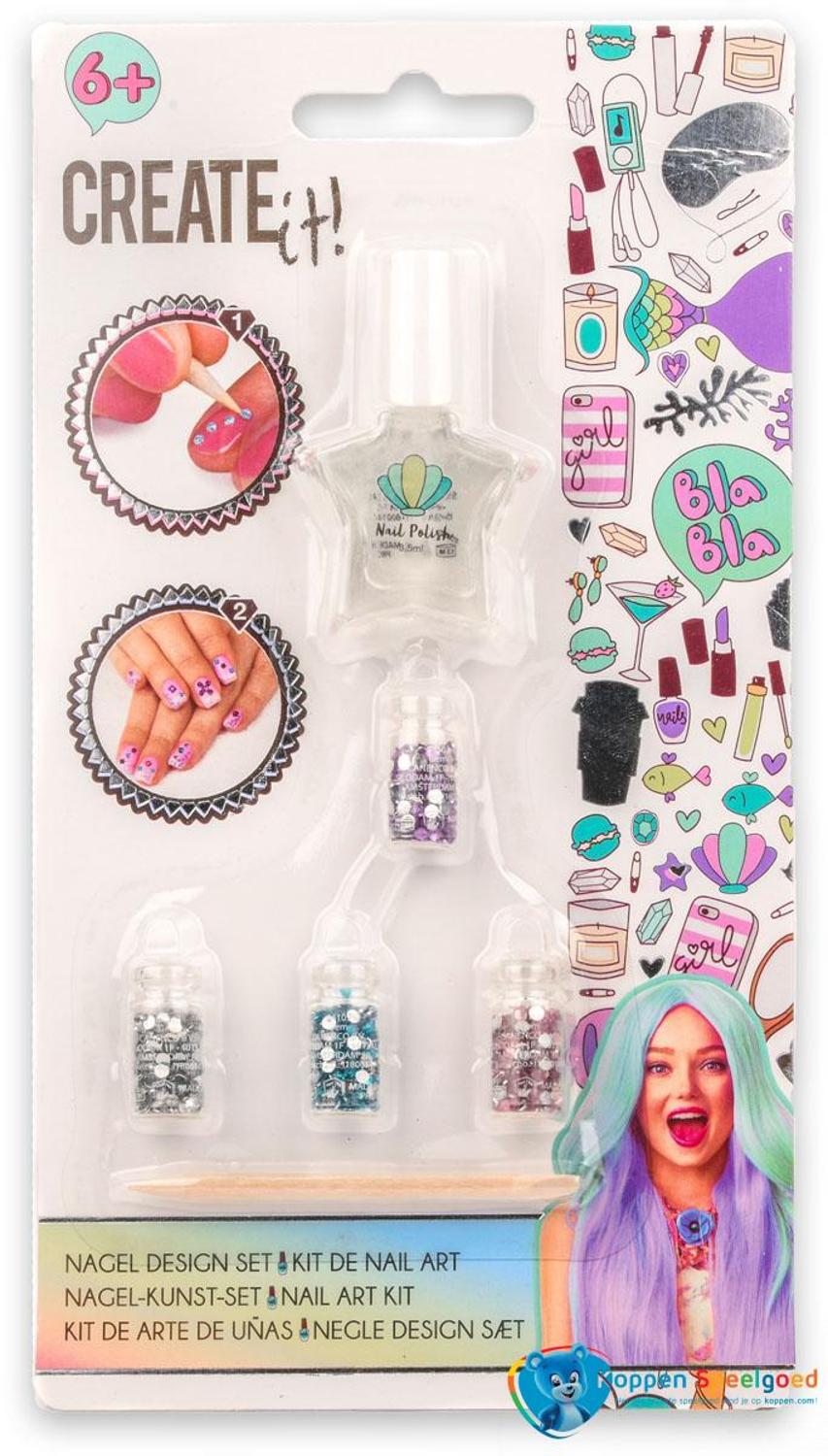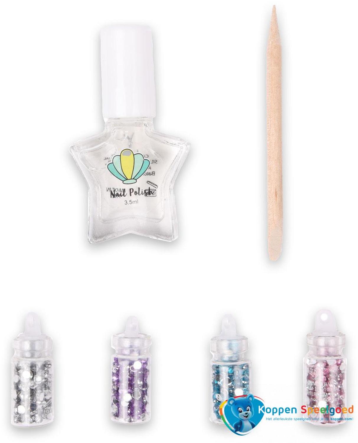 Nagel design set van Create It! waarmee je je eigen zeemeerminnagels kunt ontwerpen. Met lak, staafje en verschillende kleuren juweeltjes om op je nagels te plakken.