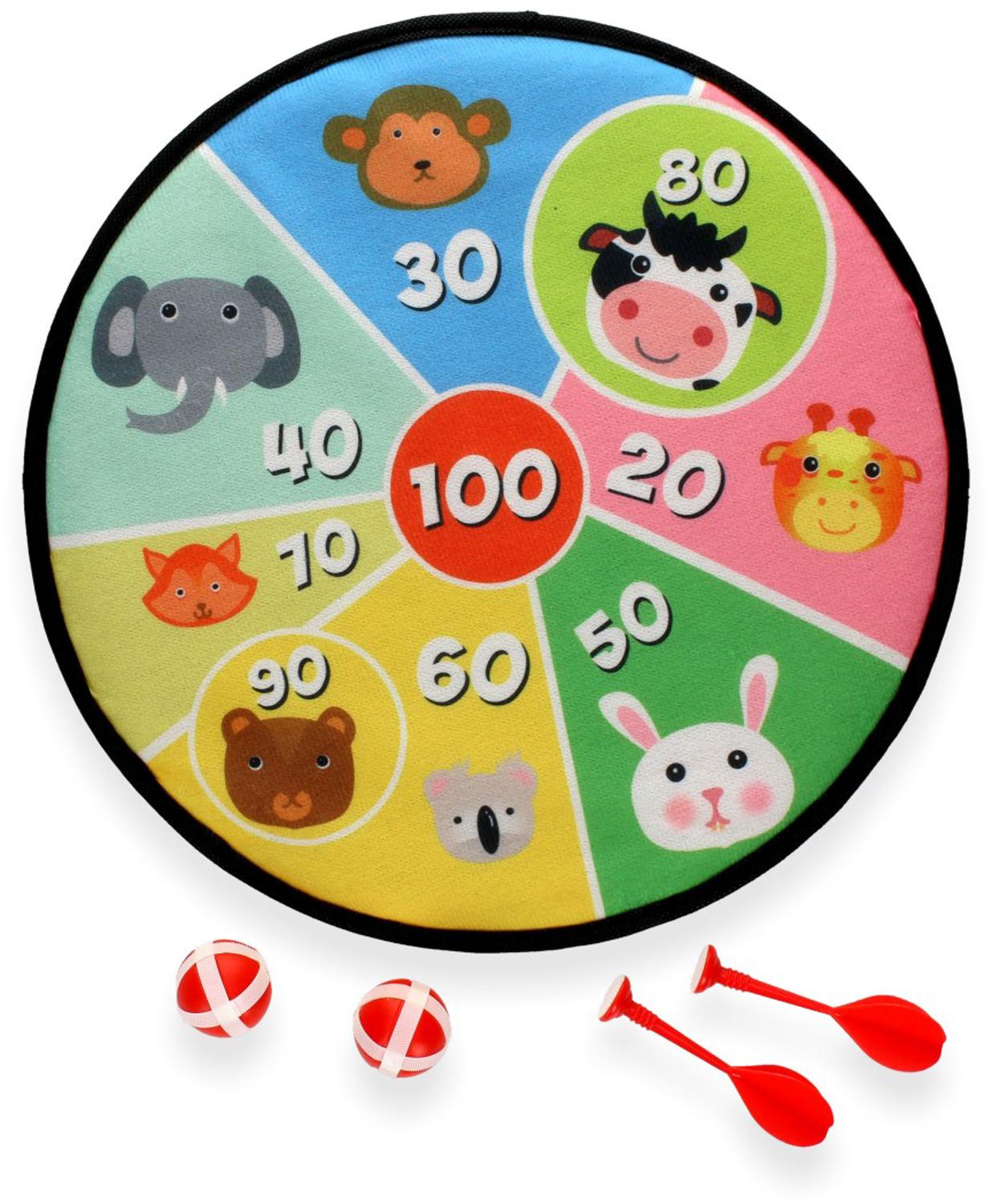 Een dartbord dier met twee balletjes en twee pijltjes. Ze blijven kleven door middel van klittenband. Elke dier heeft een andere puntenscore. In het midden haal je de hoogste score.