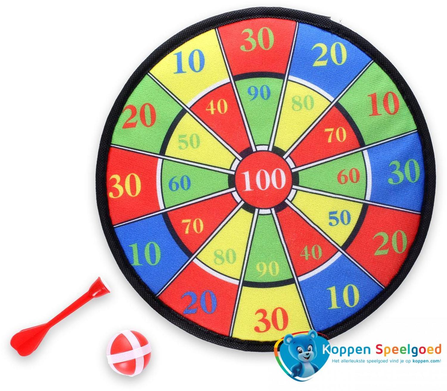 Dartboard met tientallen als scoregetallen. Voorzien van klittenband, met een pijl met klittenband en twee balletjes die op het bord blijven plakken.