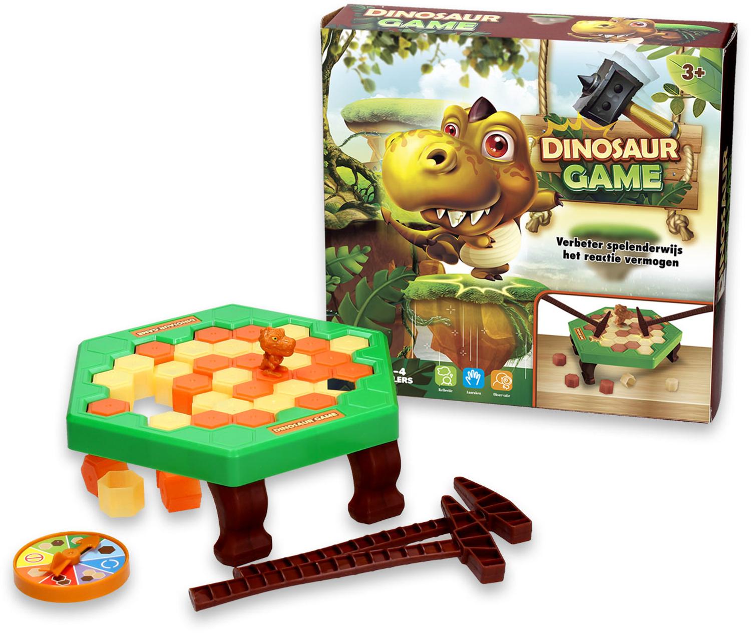 Draai, en zie welke tegels je weg moet slaan. Valt de dino? Dan verlies je!