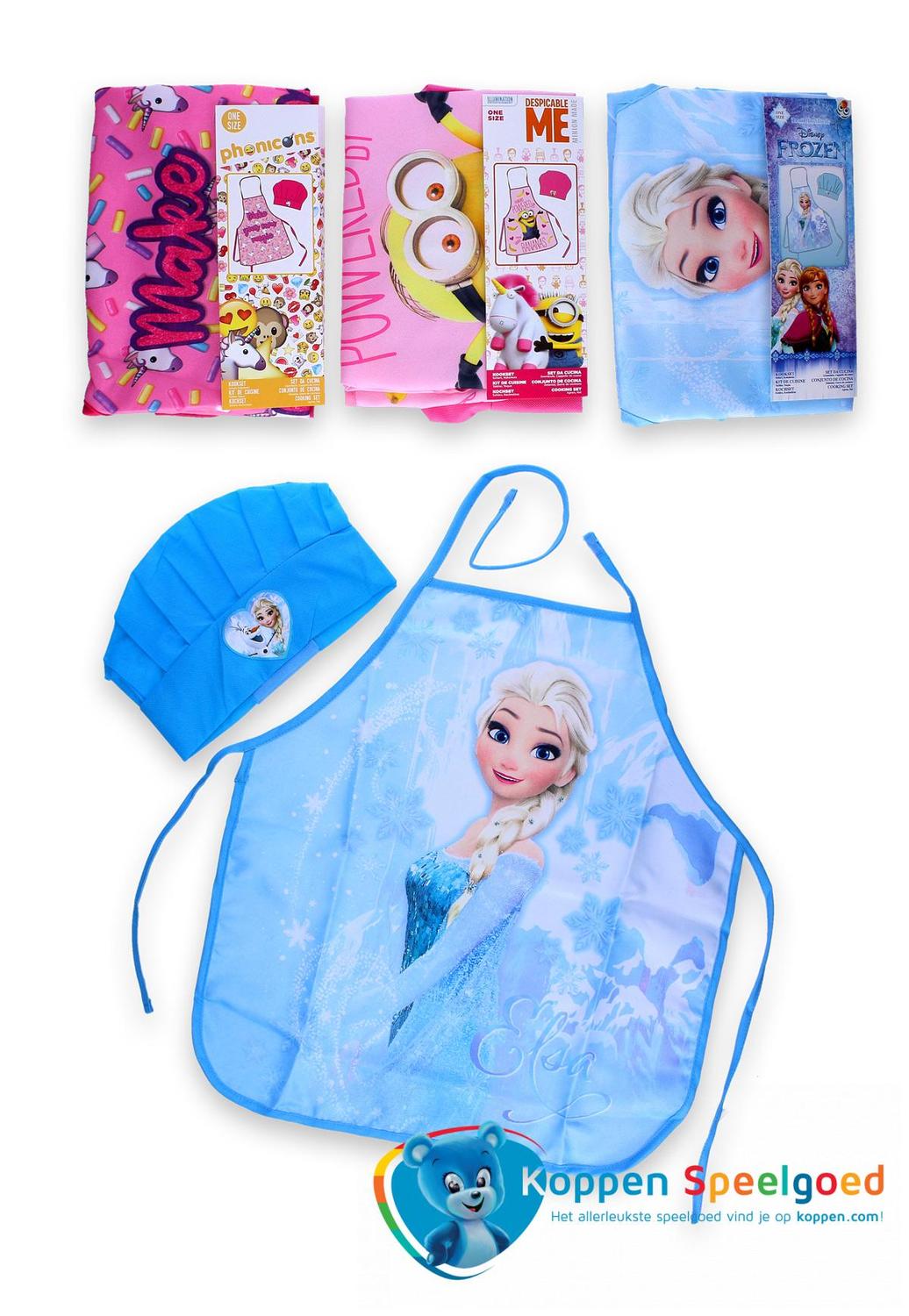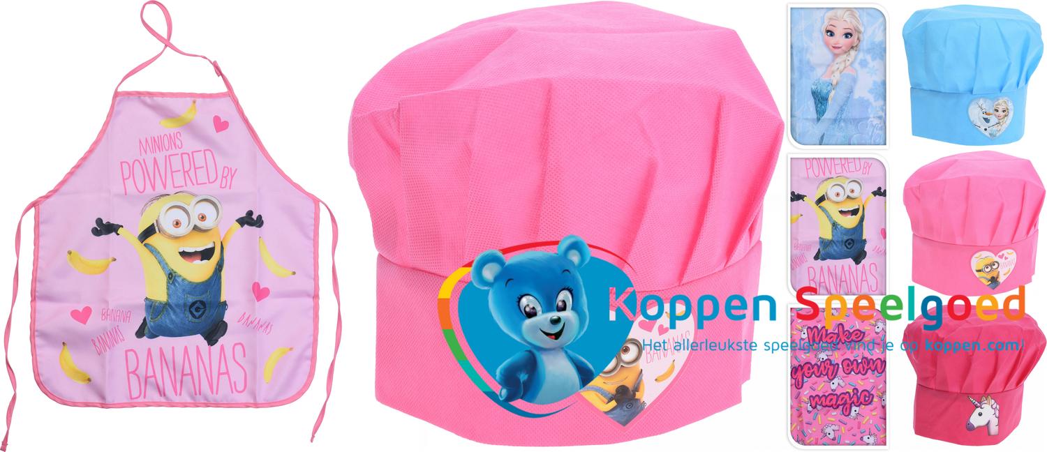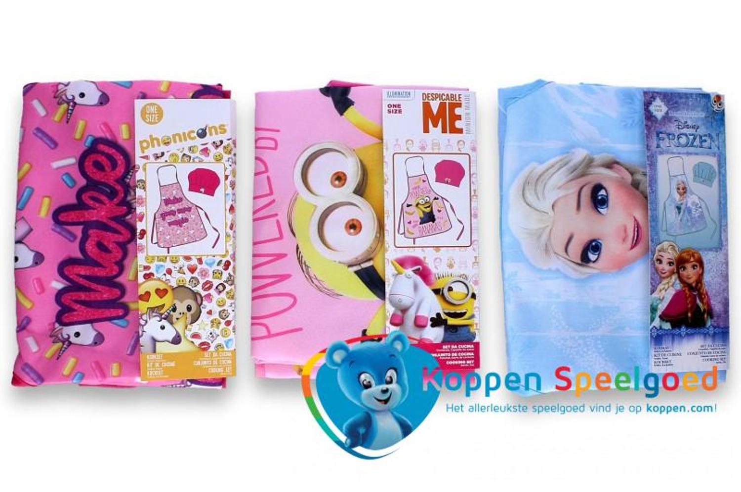 Disney kinderschort met koksmuts. Er zijn drie verschillende uitvoeringen, Frozen, Minions en eenhoorn (of unicorn) en deze worden door elkaar geleverd. De muts heeft een breedte van 25 cm. Het short is 50 x 45 cm. Leuk om je kookkunsten te vertonen! Geschikt voor kinderen vanaf drie jaar.