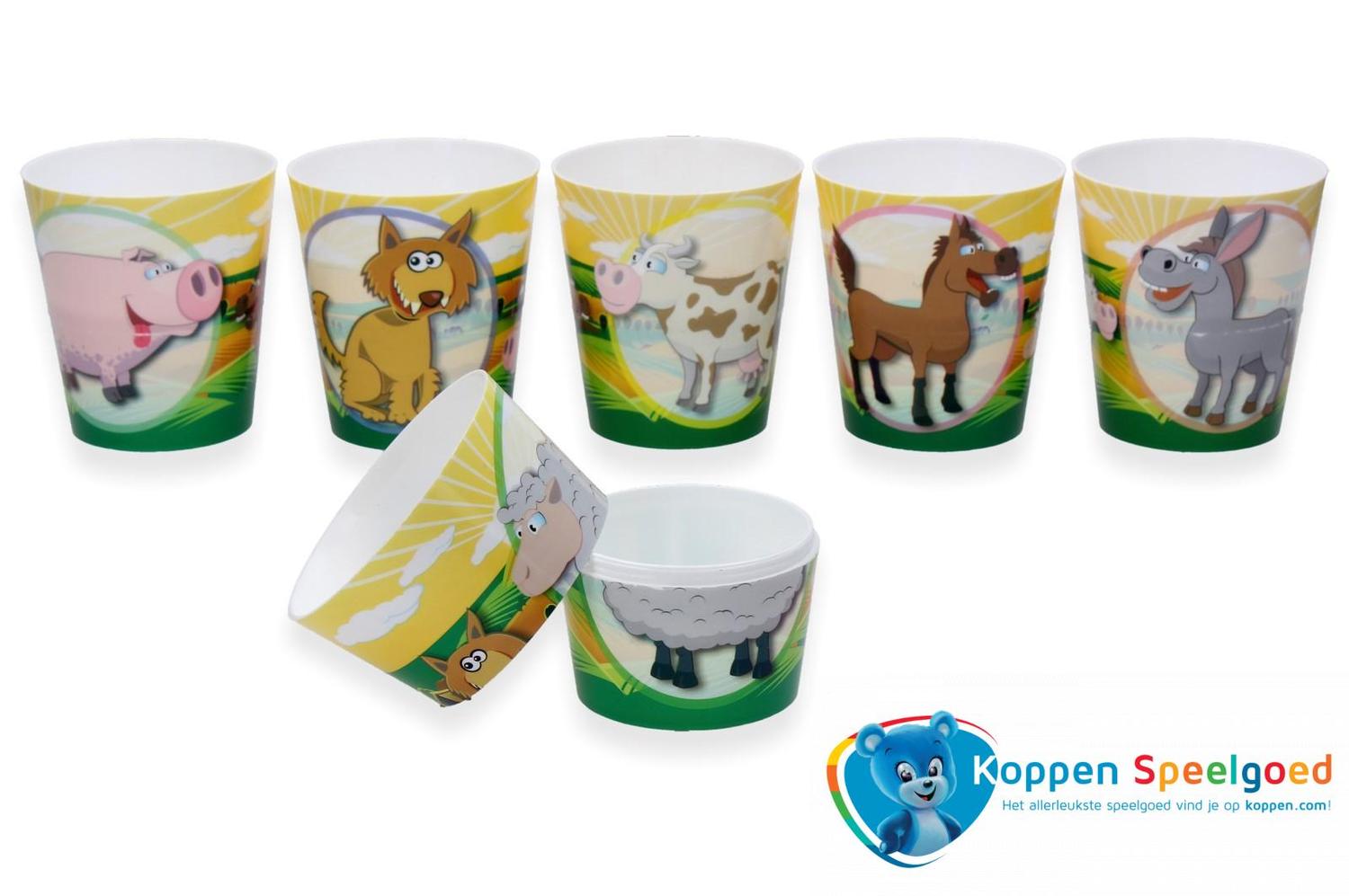 Draaibeker boerderijdieren. Deze beker bestaat uit twee delen. In het onderste deel kan je een speeltje doen en in het bovenste deel een ijsbolletje. De opdruk van de beker bestaat uit een boerderijdieren print.