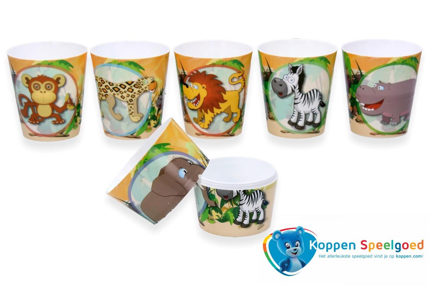 Draaibeker wilde dieren. Deze beker bestaat uit twee delen. In het onderste deel kan je een speeltje doen en in het bovenste deel een ijsbolletje. Op de beker staat een wilde dieren print.