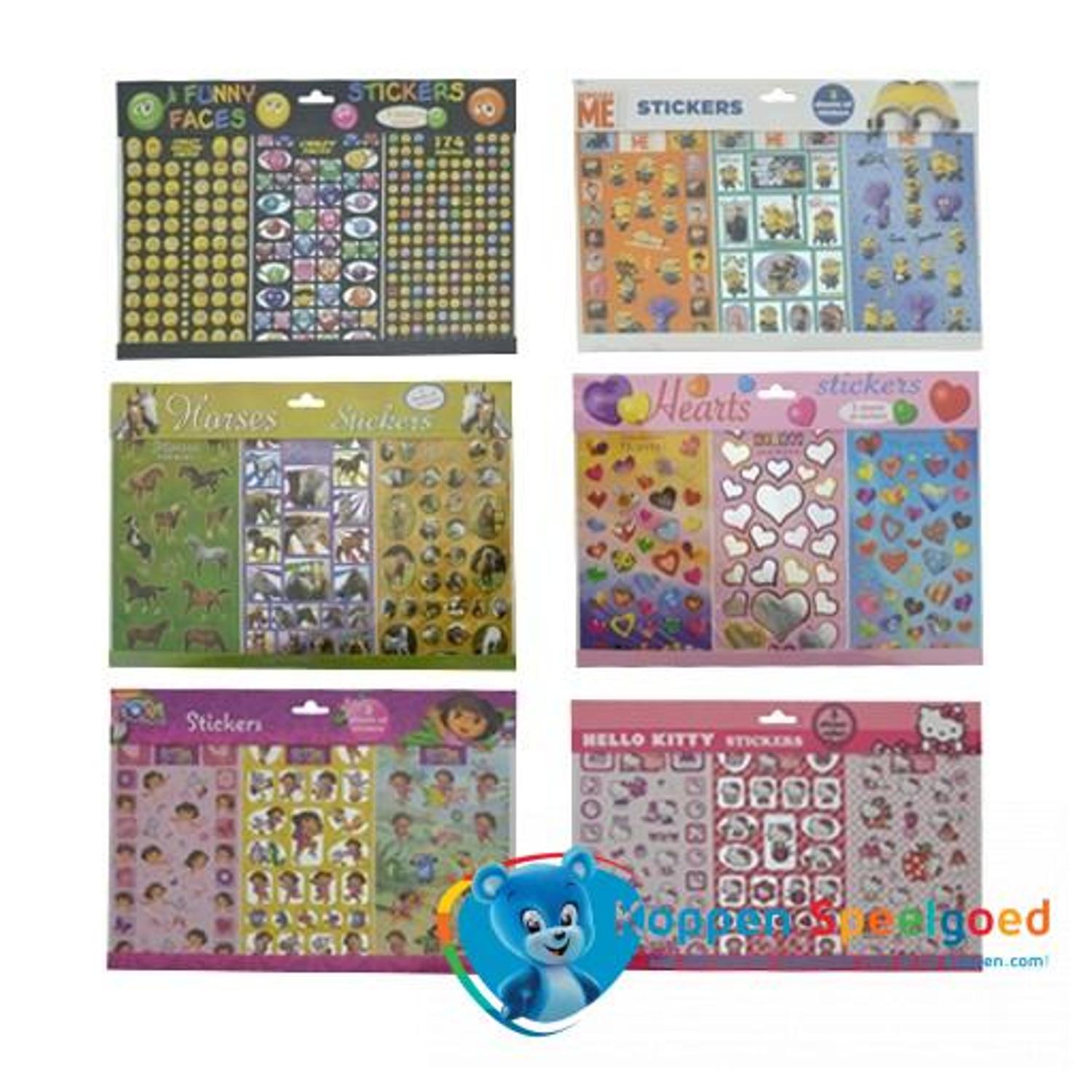 Drie stickervellen inclusief kopkaart. In de verpakking zitten drie stickervellen met allerlei stickers in een bepaald thema. Paarden, Dora, Hello Kitty, hartjes, Minion en funny faces zijn de verschillende stickers. Deze worden door elkaar geleverd.