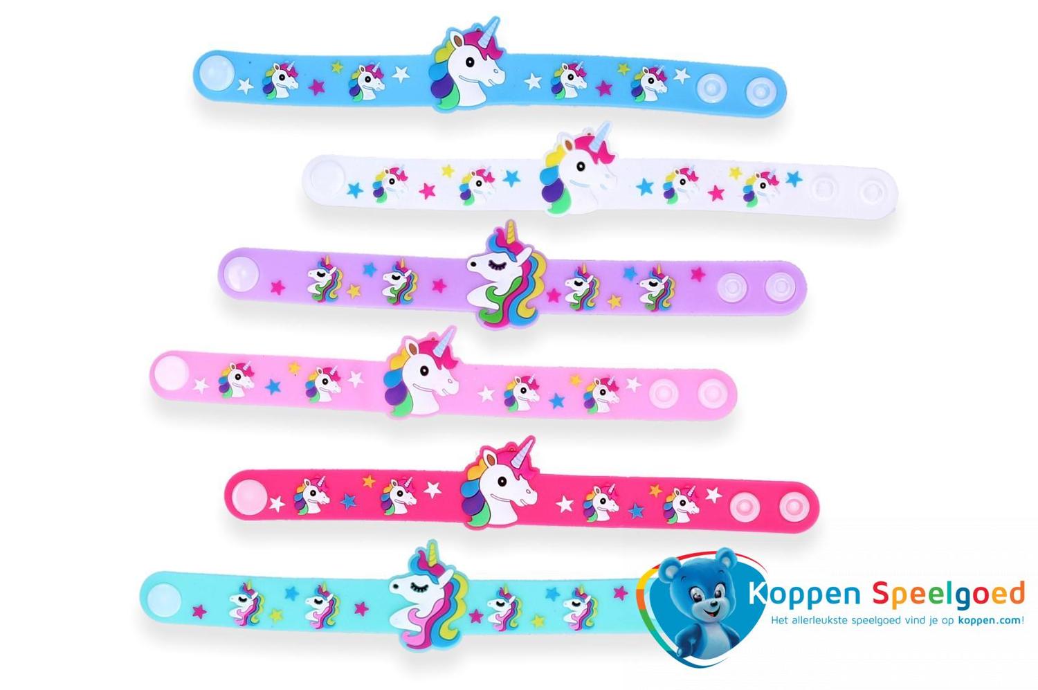 Deze armband heeft een aantal hoofden van eenhoorns op de band in 3d-reliëf, een grote en vier kleinere. De band is 21,5 cm lang en is voorzien van een drukknopsluiting met twee lengtestanden.