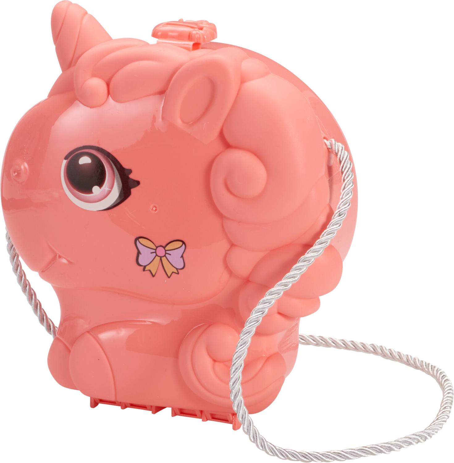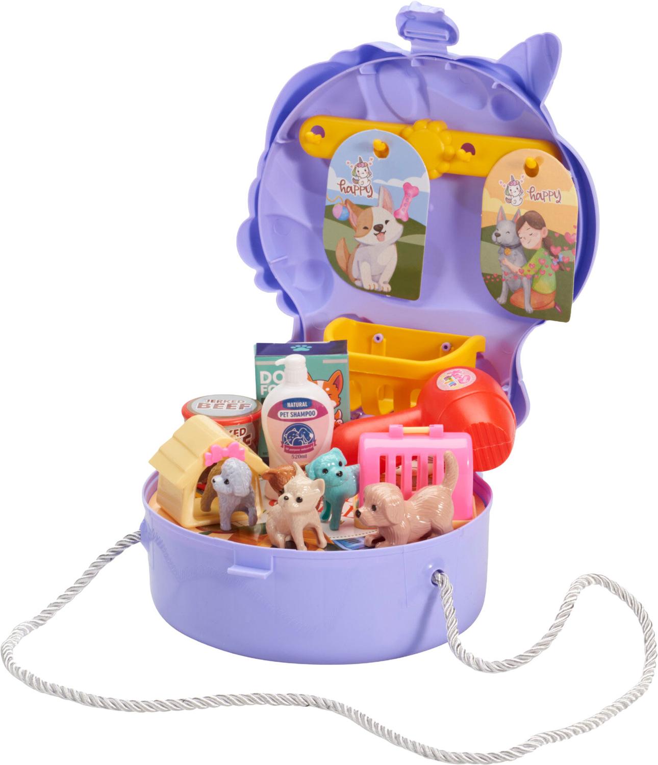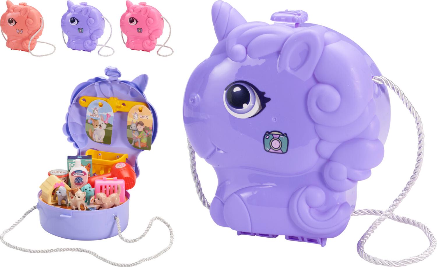 Dubbel zoveel speelplezier! In dit betoverende eenhoorn tasje zitten schattige hondenpoppetjes en alles wat je nodig hebt om voor ze te zorgen. Van hondenhokje tot hondenshampoo. Alles past handig in het vrolijke tasje met leuke eenhoorn-details. Perfect om mee te nemen en overal je eigen mini-dierensalon te starten!