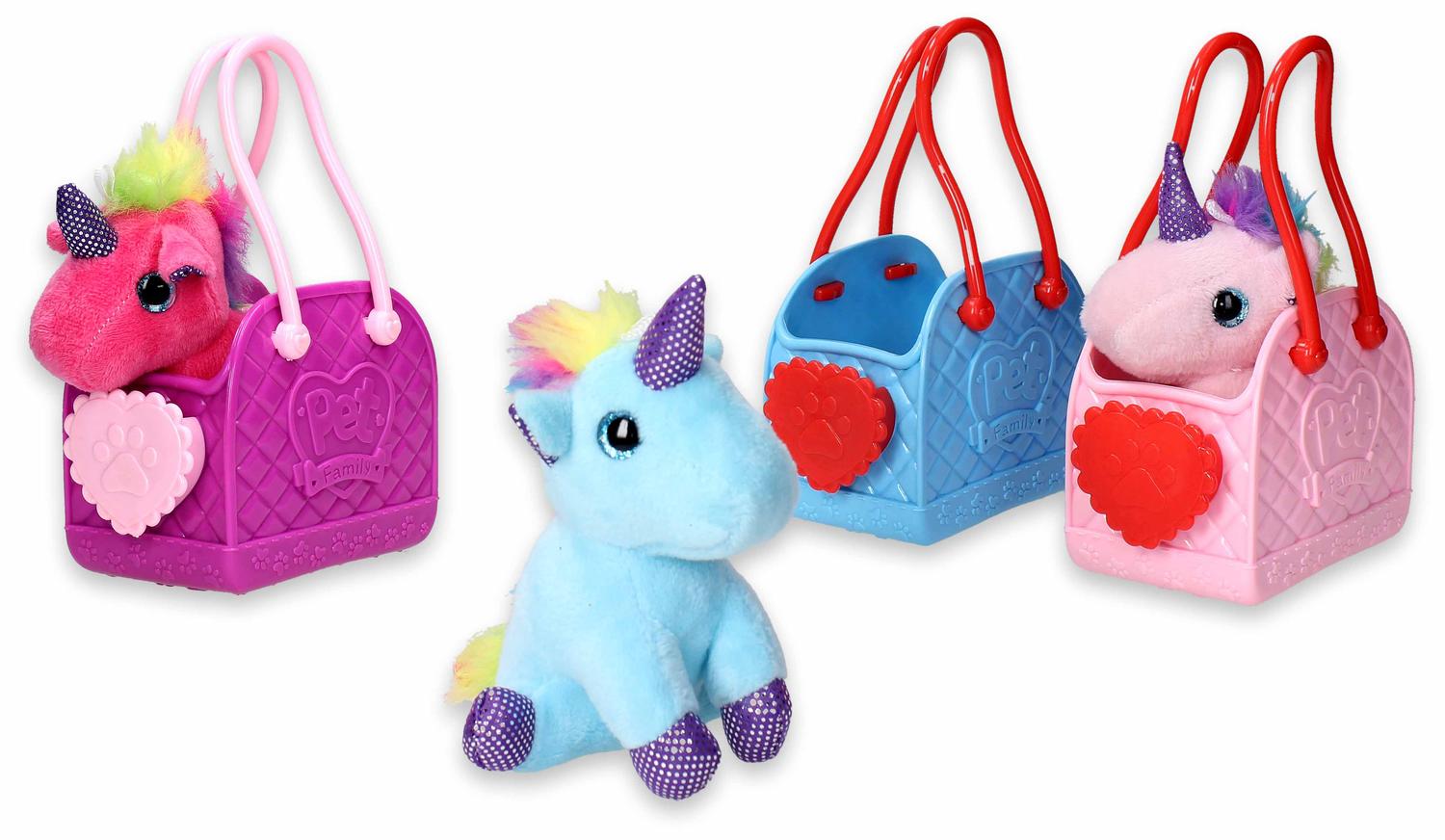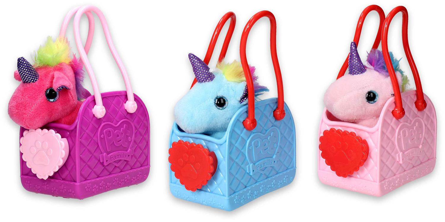 Eenhoorn in tasje is een schattig speelgoedsetje bestaande uit een zachte pluche eenhoorn in een kleurrijk kunststof tasje met handvatten. Verkrijgbaar in meerdere varianten en kleuren, zoals roze, blauw en paars. Het compacte formaat maakt het ideaal om mee te nemen, terwijl de vrolijke uitstraling kinderen uitnodigt tot fantasierijk spel. Perfect als cadeautje, spaarartikel of verrassingsitem voor kinderen vanaf 3 jaar