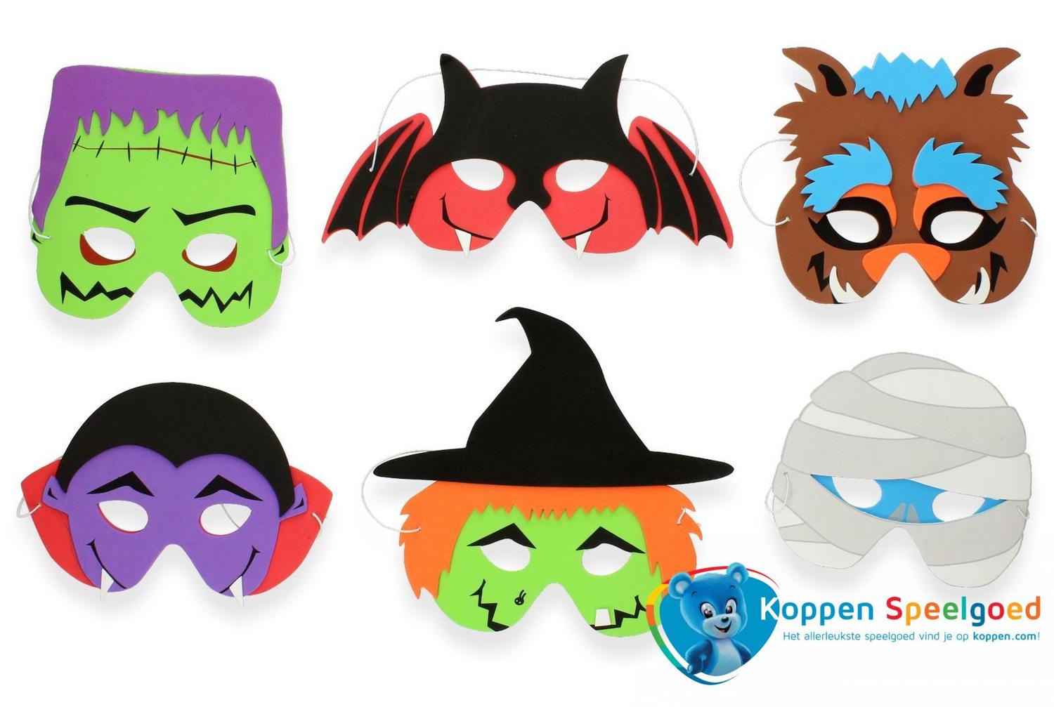 Deze maskers van griezelgezichten zijn van zacht foam gemaakt. Je zet ze met elastiekjes aan je oren vast. Wie ga jij laten schrikken? Leuk voor verkleden en Halloween!