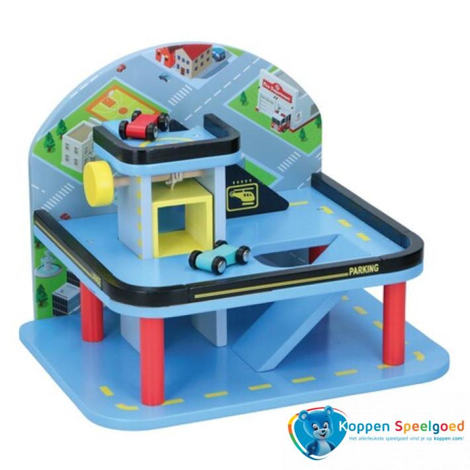 Mooie speelset van een parkeergarage in hout uitgevoerd. Met 2 voertuigen en een werkende lift.
