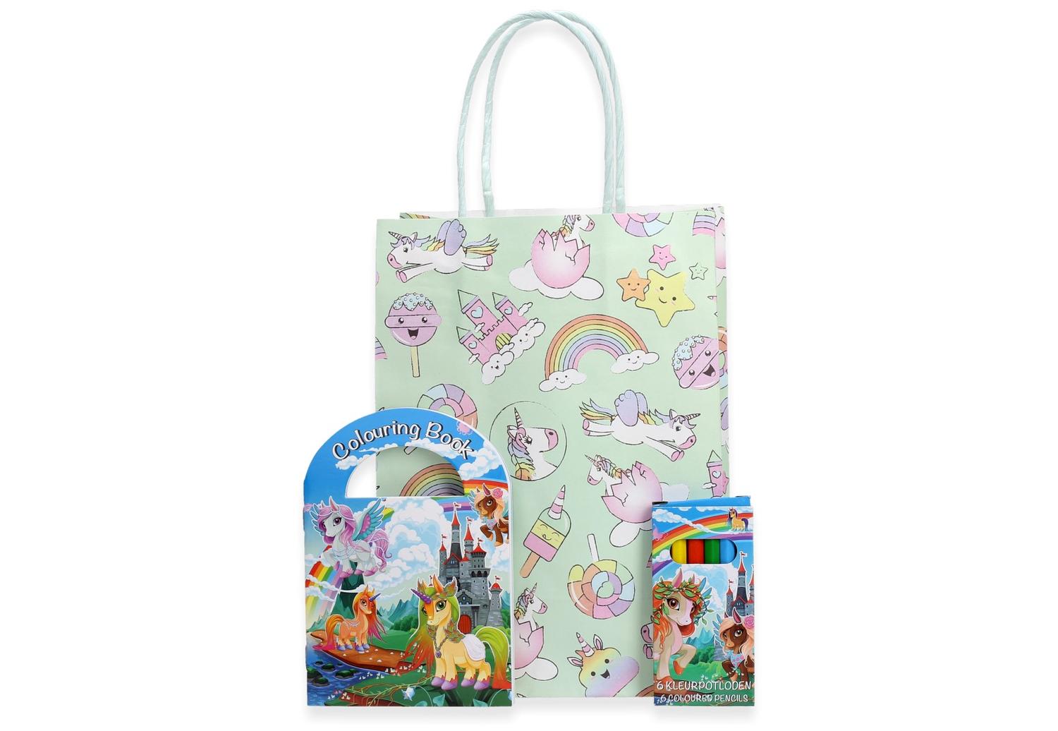 Een eenhoorn geschenktas met eenhoorn kleurpotloden en eenhoorn kleurboekje.