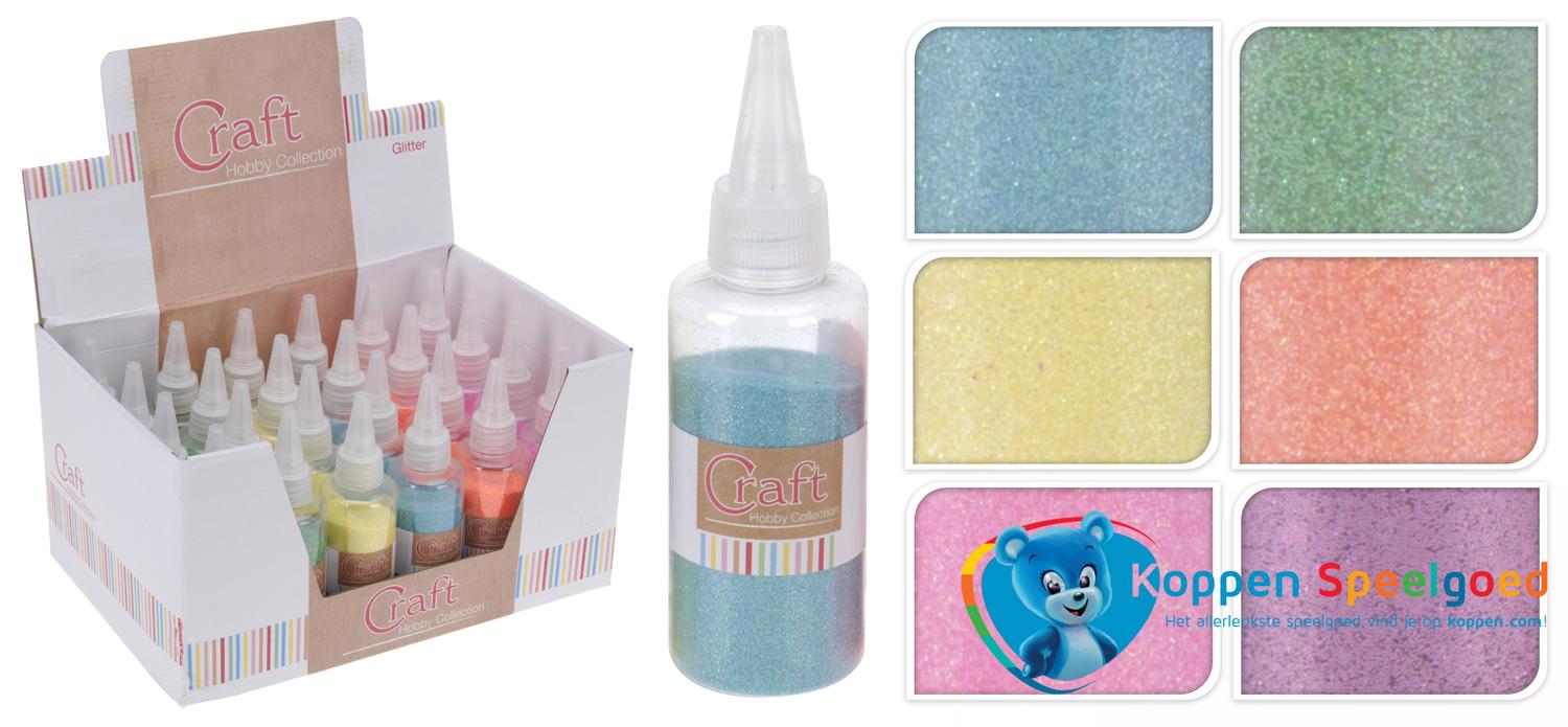 Flesjes met glitterpoeder. Breng ergens wat lijm op aan en bestrooi dat met dit glitterpoeder. Er blijft een prachtige glitterlaag achter! De flacons hebben een prettige doseerdop.