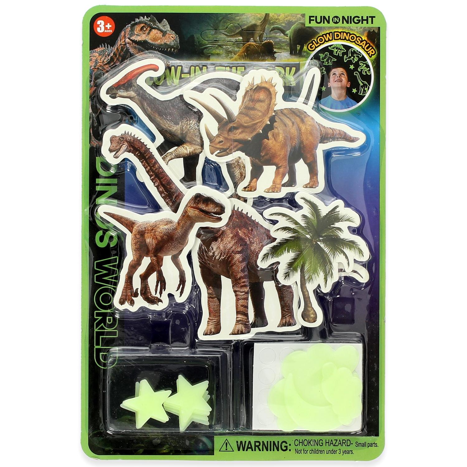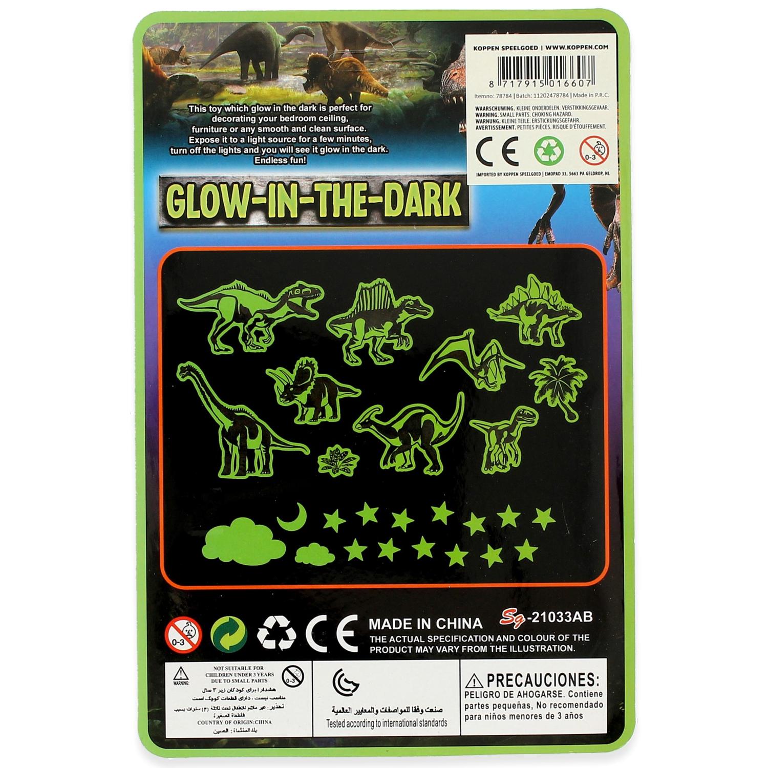 Glow in the dark dino figuren, een variatie aan verschillende dino afbeelding die glow in the dark zijn. Op de tweede foto staat een overzicht van welke figuren. Bij het product zitten ook klevers om de figuren aan het plafond op te hangen.