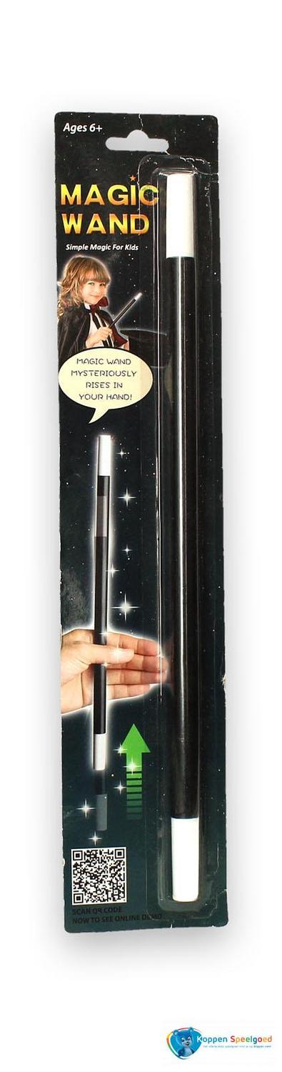 Goochel toverstaf. Zet je publiek te kijk met deze toverstaf. Door middel van een elastiekje kan je de toverstaf laten bewegen, zonder dat het publiek ziet wat er gebeurt. Scan de QR code op de kaart voor verdere uitleg. Geschikt voor kinderen vanaf zes jaar.