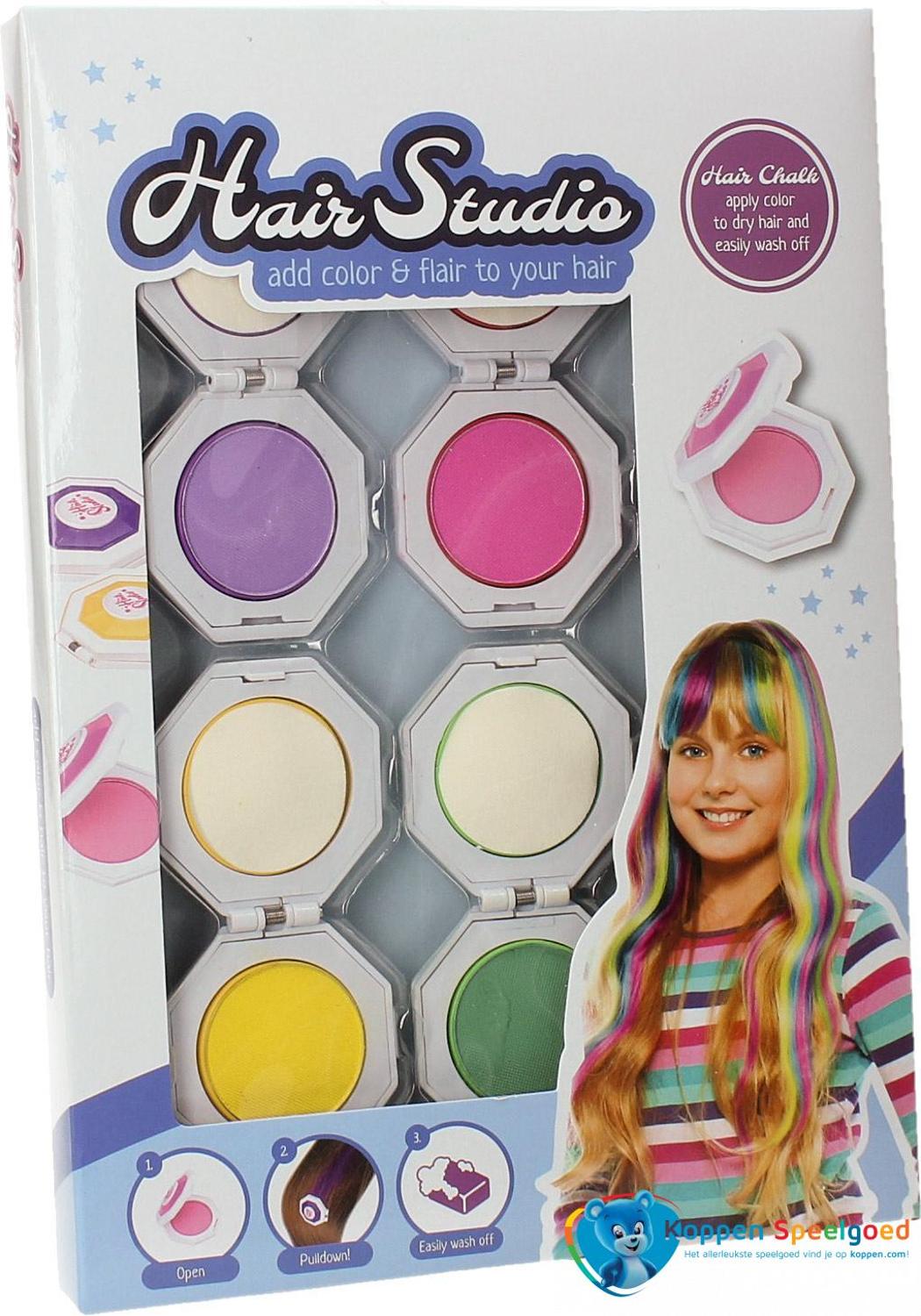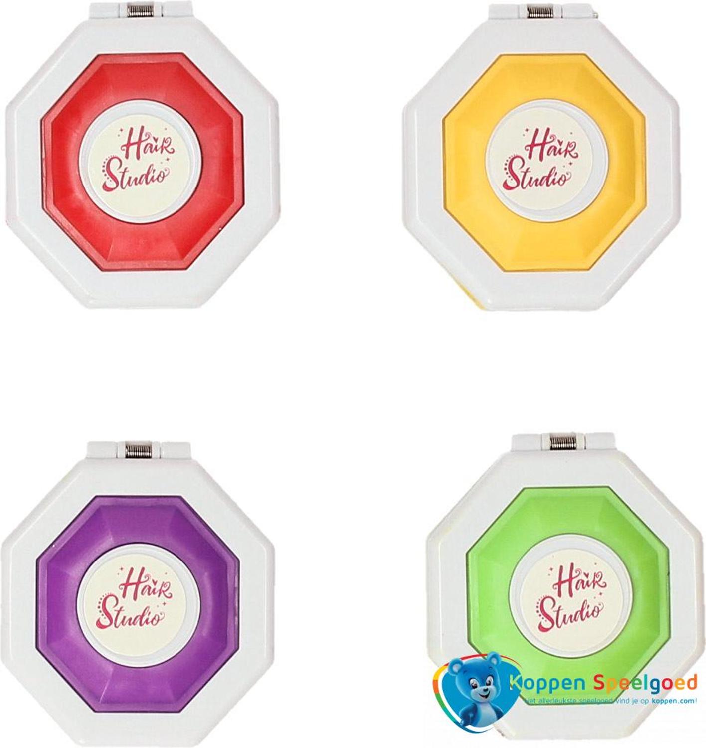 Haarkrijt kleurset in doos. Deze kleurset bevat vier verschillende kleuren, paars, roze, geel en groen. Makkelijk in gebruik. Stop je haren tussen de klepjes en trek naar beneden. Makkelijk om je haren te wassen. Geschikt voor kinderen vanaf vijf jaar.