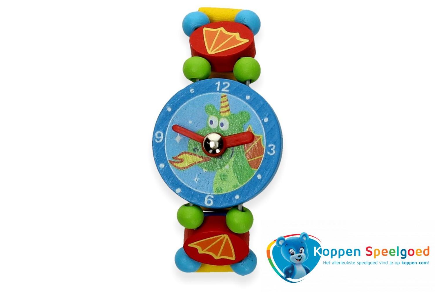 Houten speelhorloge met een opdruk van een dino en in bijpassende kleuren. Het horloge is bedoeld als speelhorloge en is geen echt uurwerk. Je kunt de wijzers met de hand verdraaien.