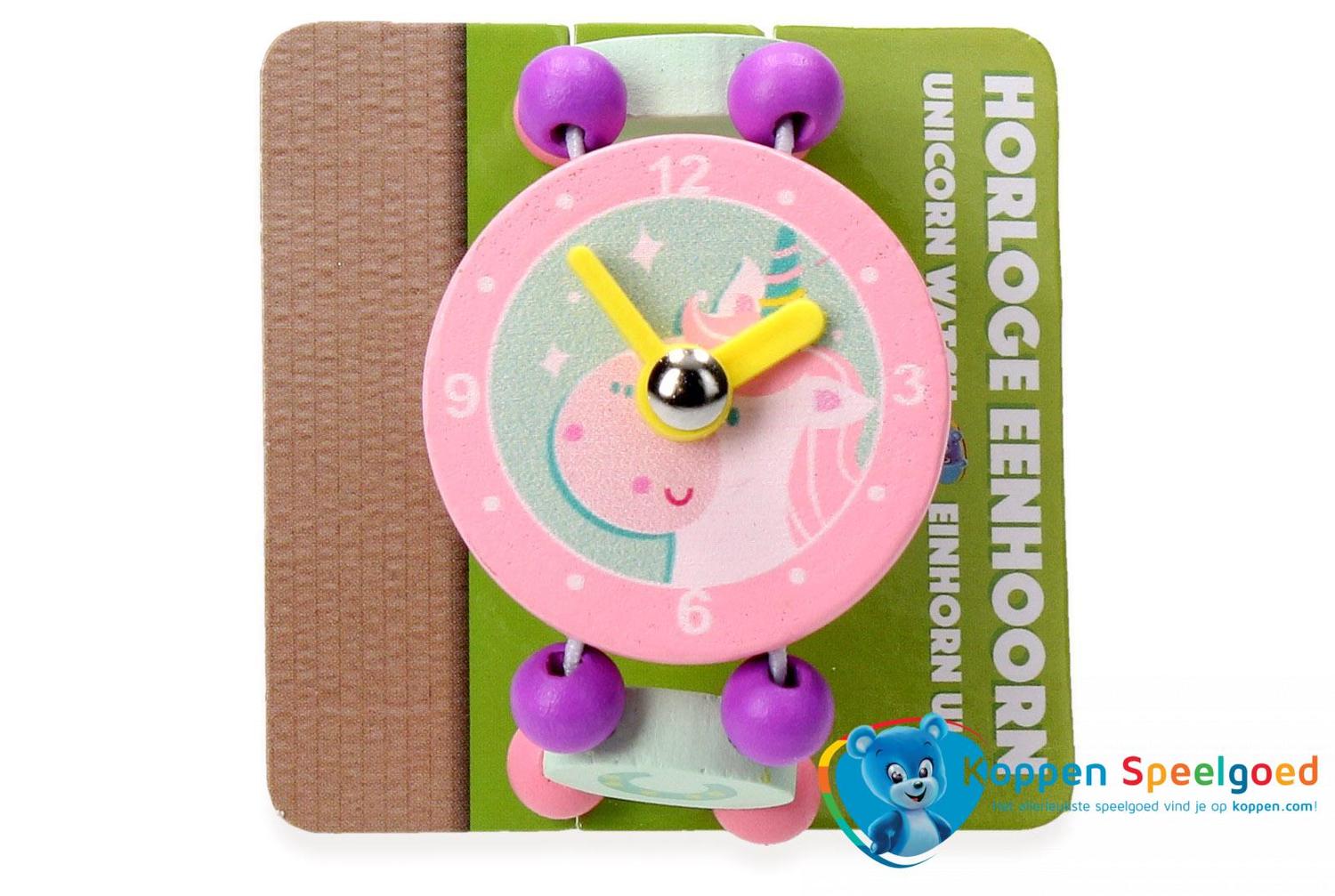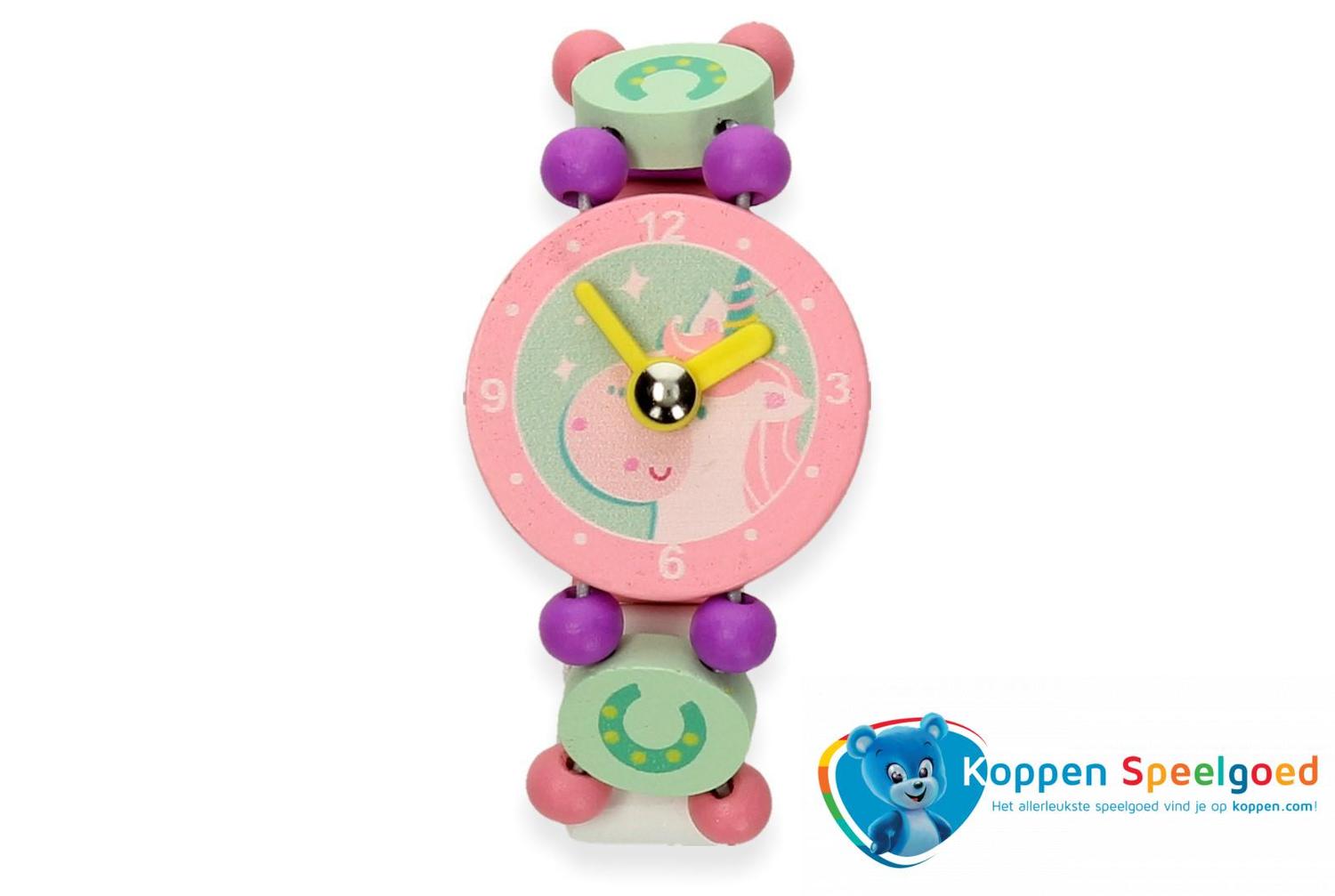 Houten speelhorloge met een opdruk van een eenhoorn en in bijpassende kleuren. Het horloge is bedoeld als speelhorloge en is geen echt uurwerk. Je kunt de wijzers met de hand verdraaien.