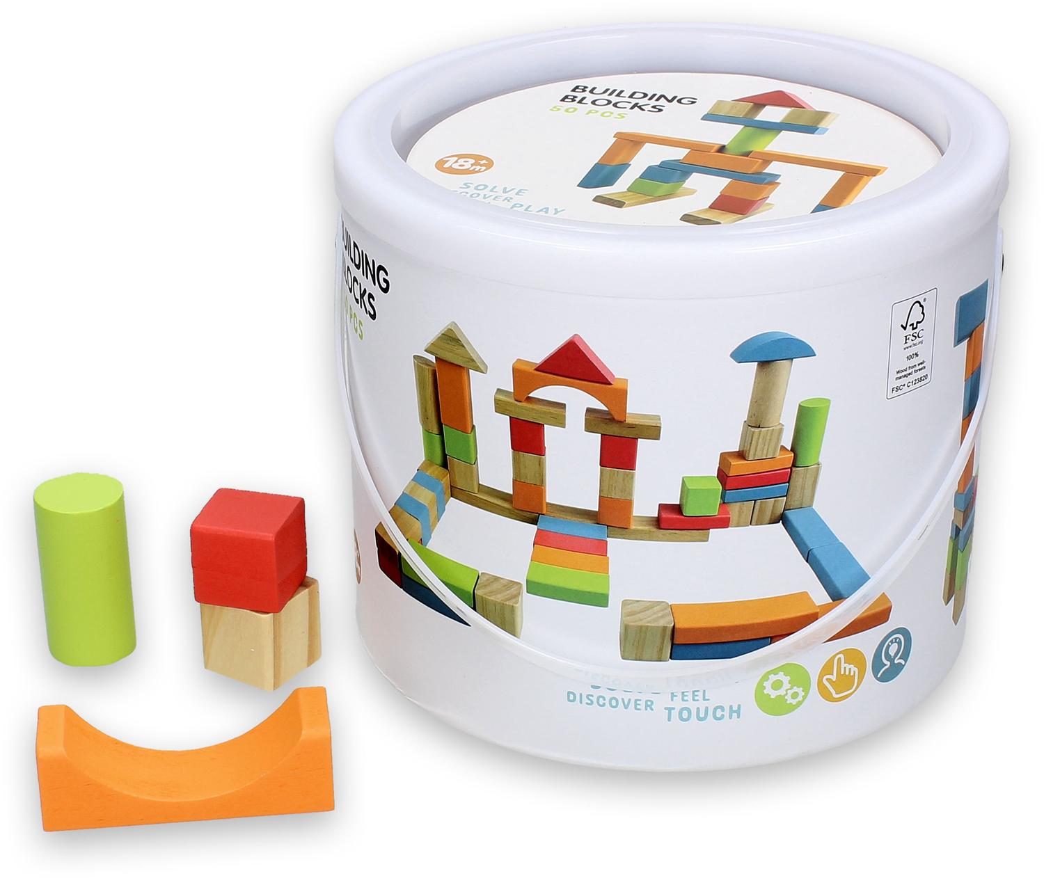 Bouwen, stapelen en eindeloos combineren! In deze handige emmer zitten 50 houten blokken in verschillende kleuren en vormen. Perfect voor het stimuleren van creativiteit, fantasie en motorische vaardigheden. Klaar met spelen? Alles past weer netjes terug in de emmer. Bouwpret gegarandeerd!