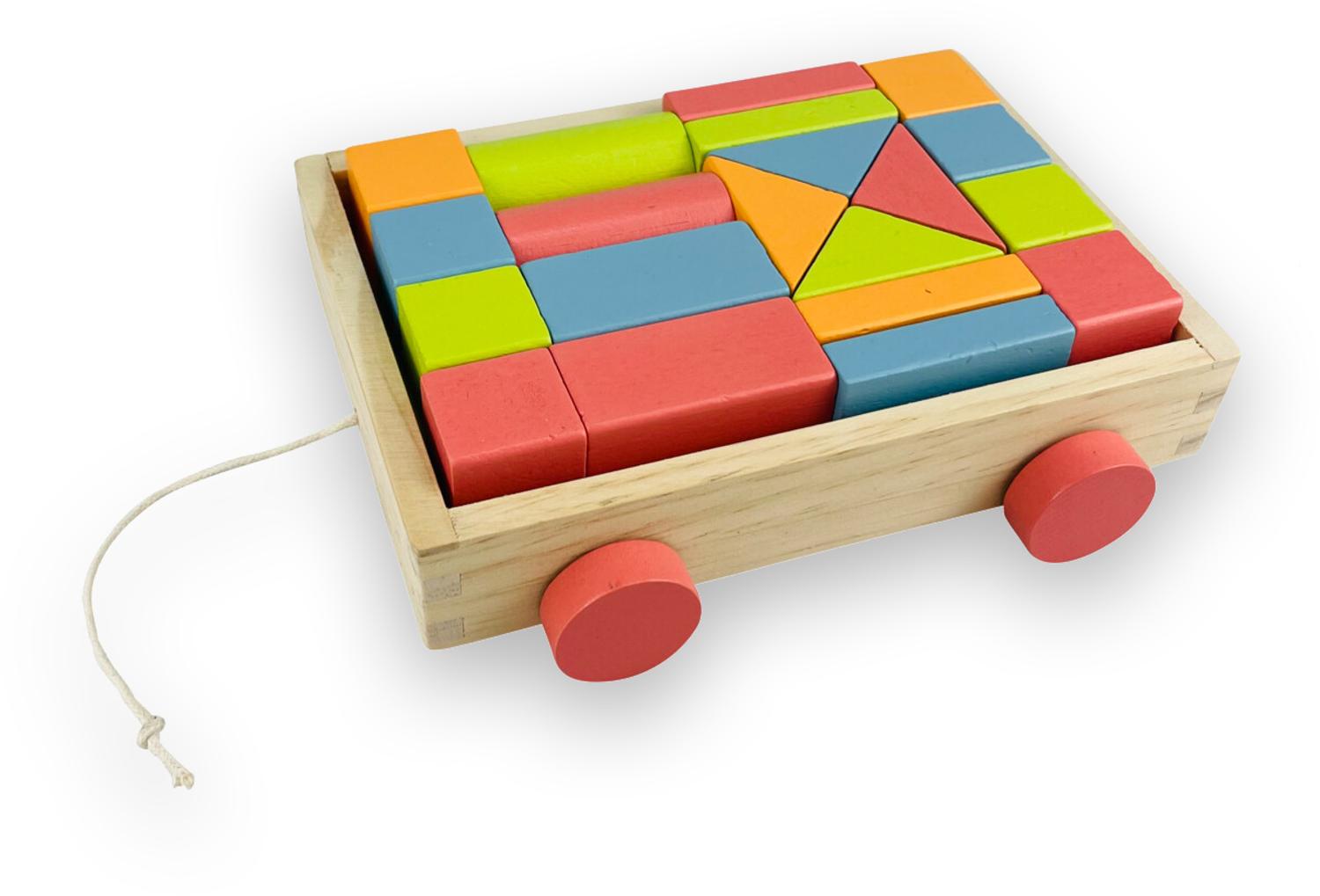 Kinderen die net hebben leren lopen zullen de grootste lol beleven met deze houten trekkar, gevuld met gekleurde blokken! De blokkenkar heeft vier houten wielen en bevat 20 blokken in verschillende kleuren. Gebruik de kar om de blokken te vervoeren of natuurlijk als ondergrond voor verschillende motieven en/of bouwwerken. Speelmogelijkheden genoeg!