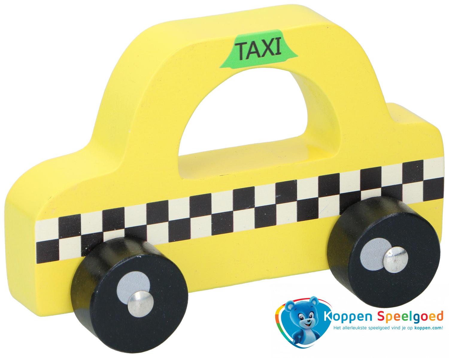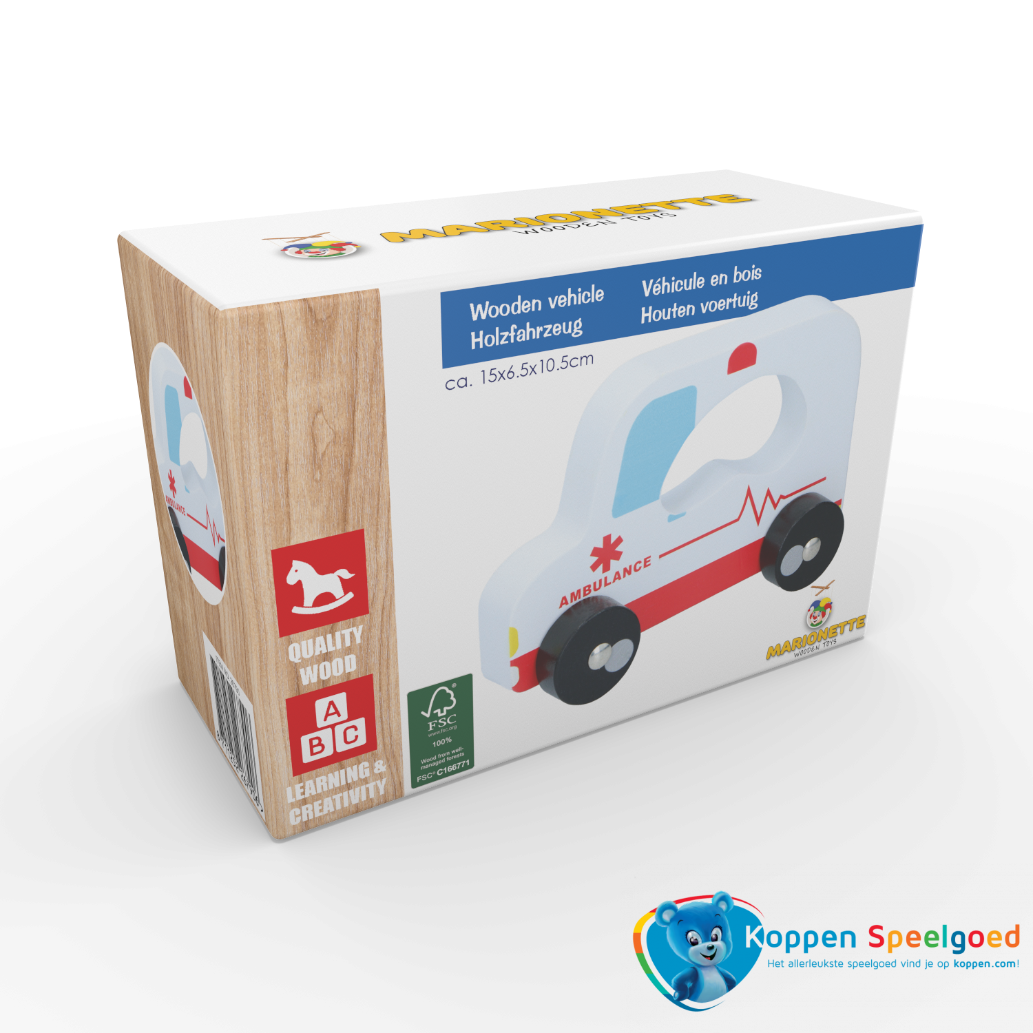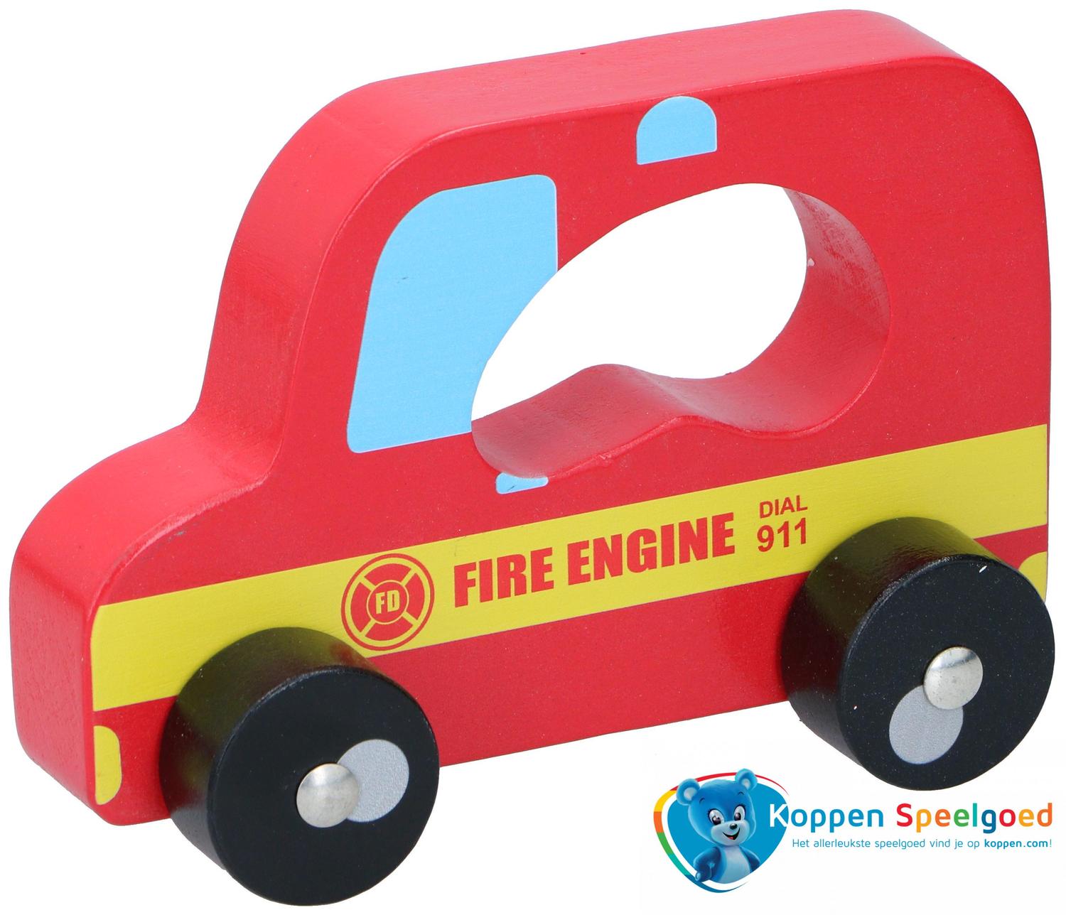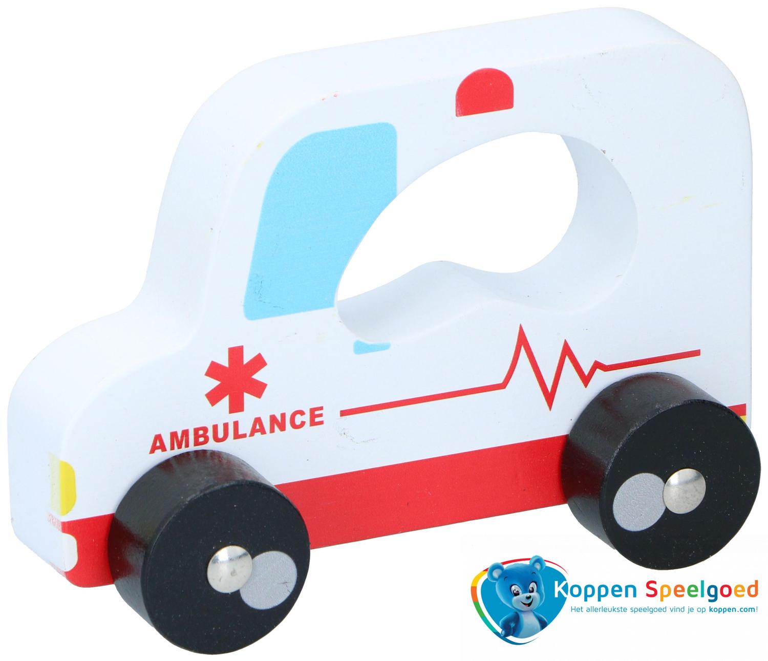 Houten speelgoed auto's met draaiende wielen. Er zijn diverse varianten zoals een ambulance, een brandweer auto, een politiewagen en een taxi.
