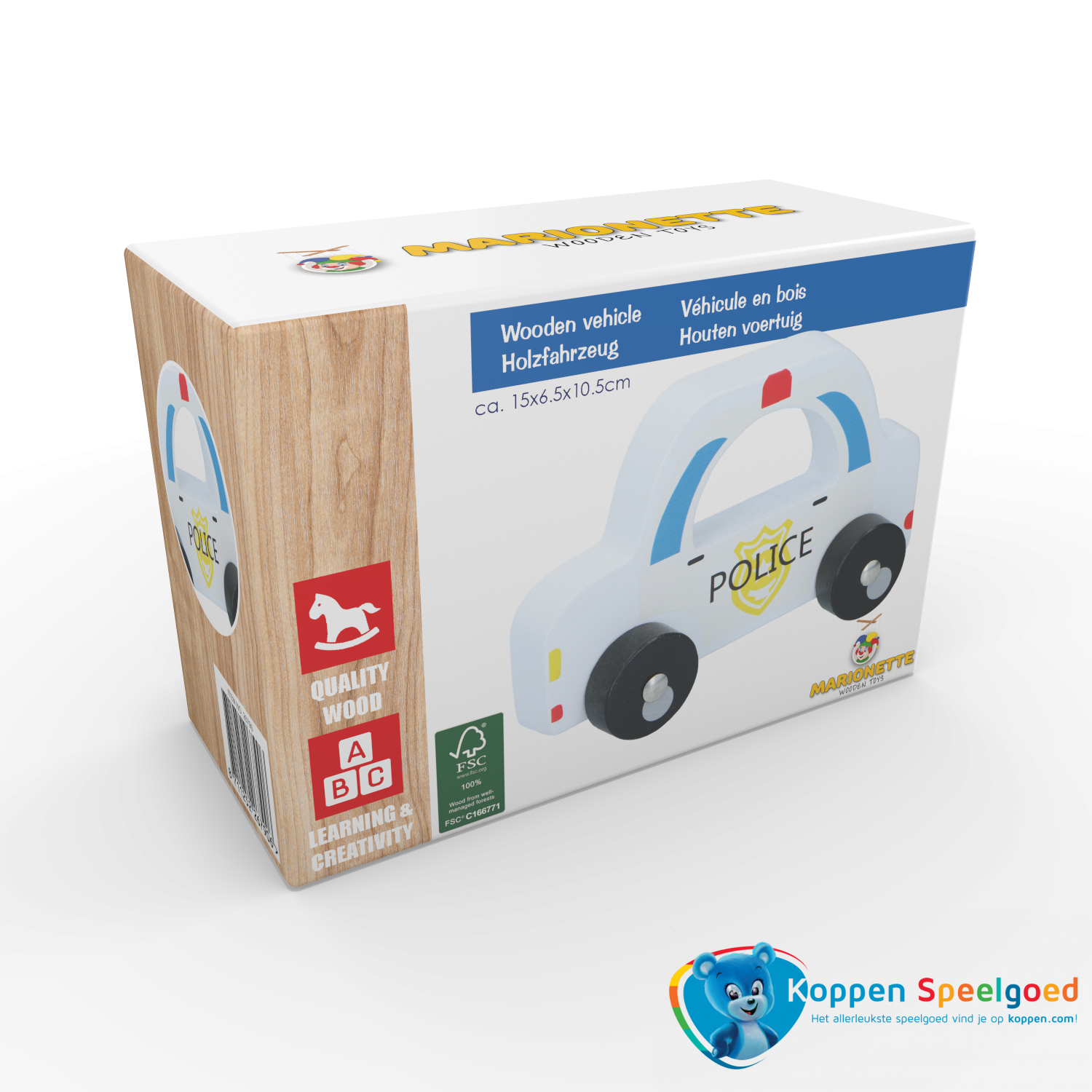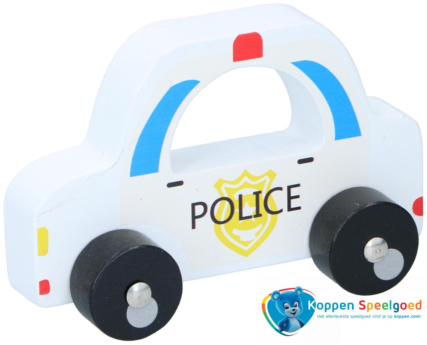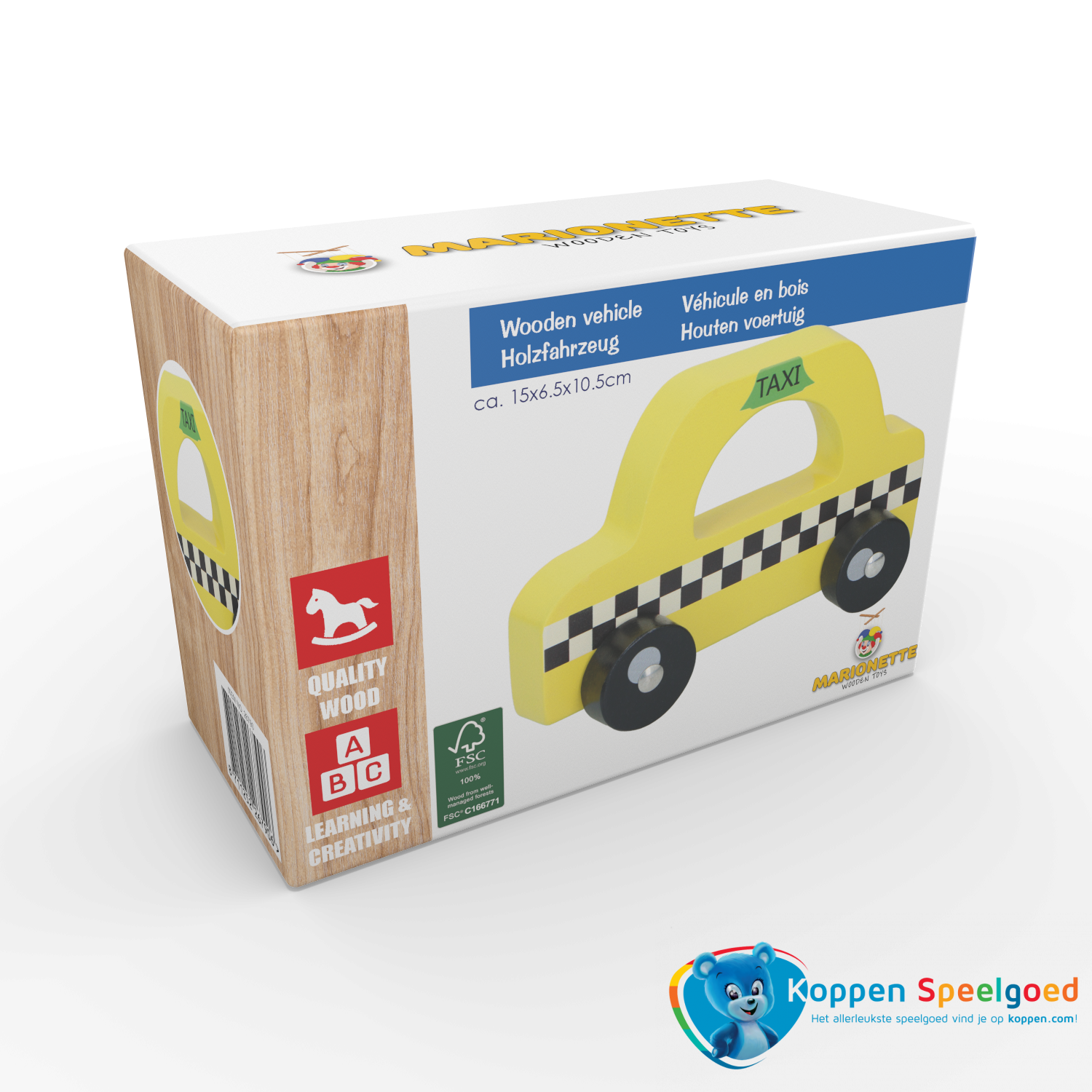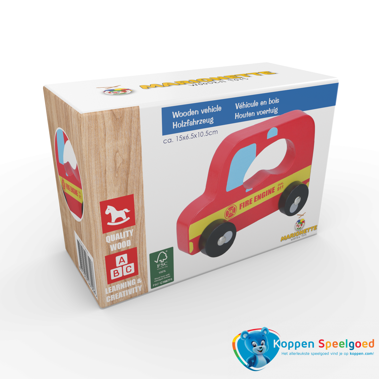 Houten speelgoed auto's met draaiende wielen. Er zijn diverse varianten zoals een ambulance, een brandweer auto, een politiewagen en een taxi.
