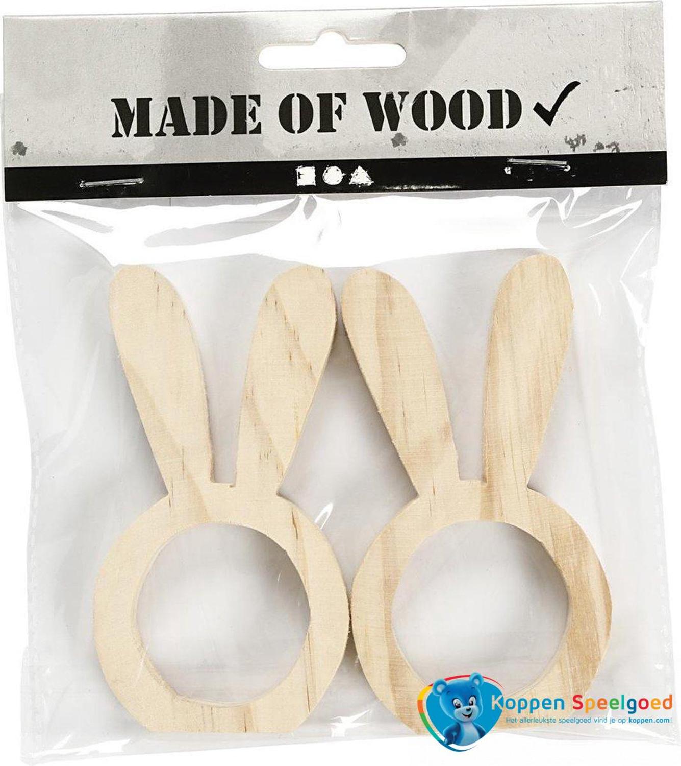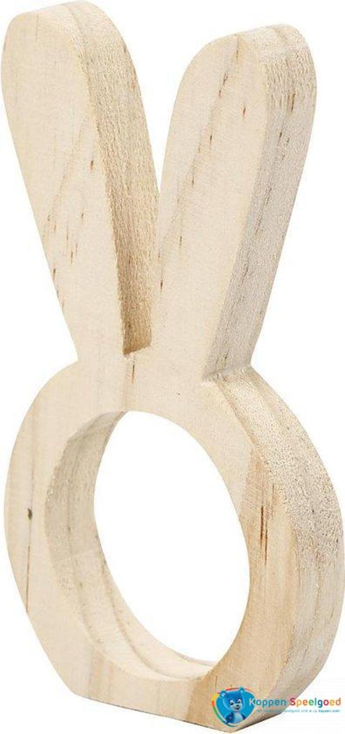 Een set van 2 servetringen van hout, in de figuur van een konijnenhoofd. Deze houders voor een servet kan je zelf verder afwerken. Je steekt een opgerold servet door een van de houders. De servethouders zijn gemaakt van licht gekleurd, massief hout. Het figuur kan zelfstandig staan.