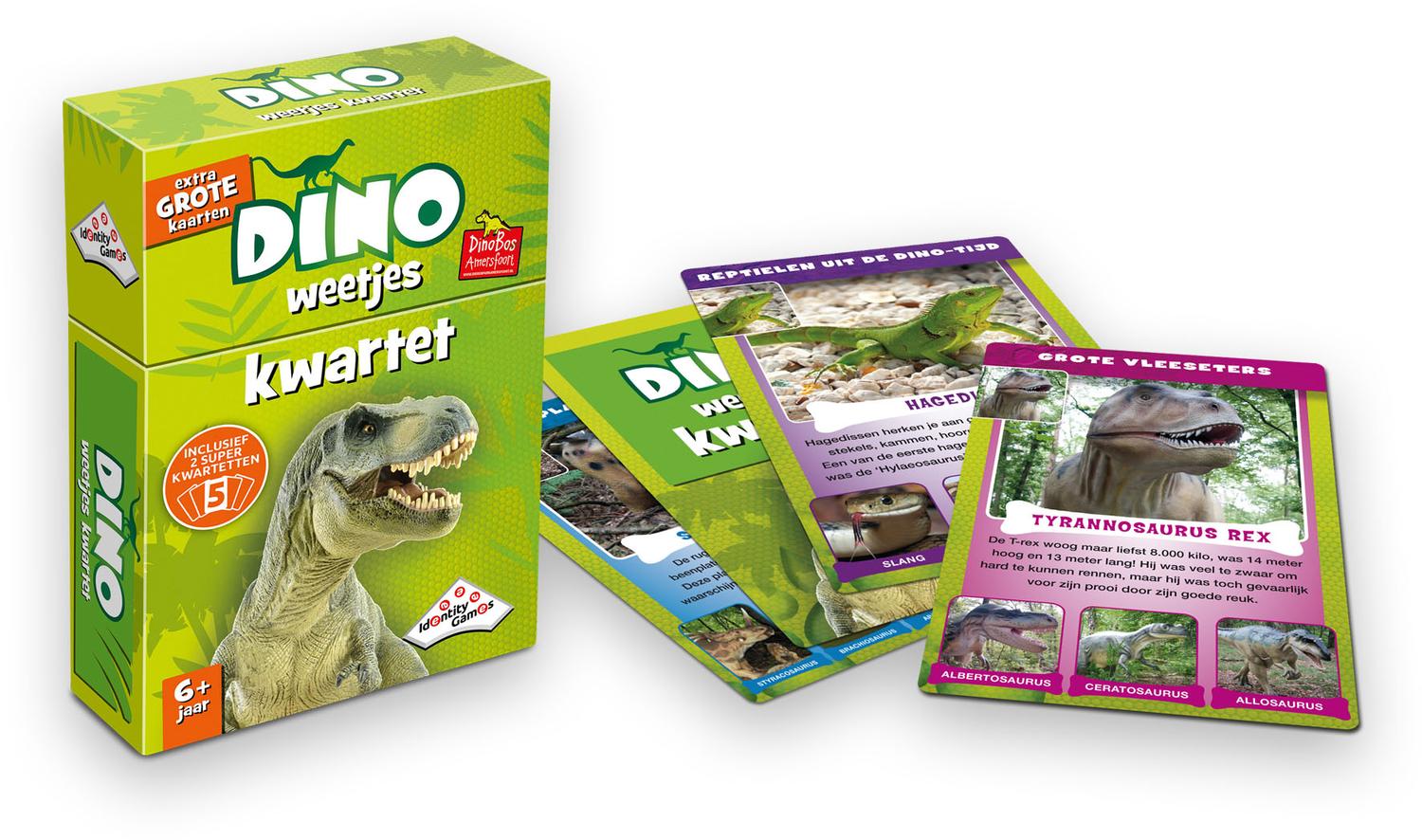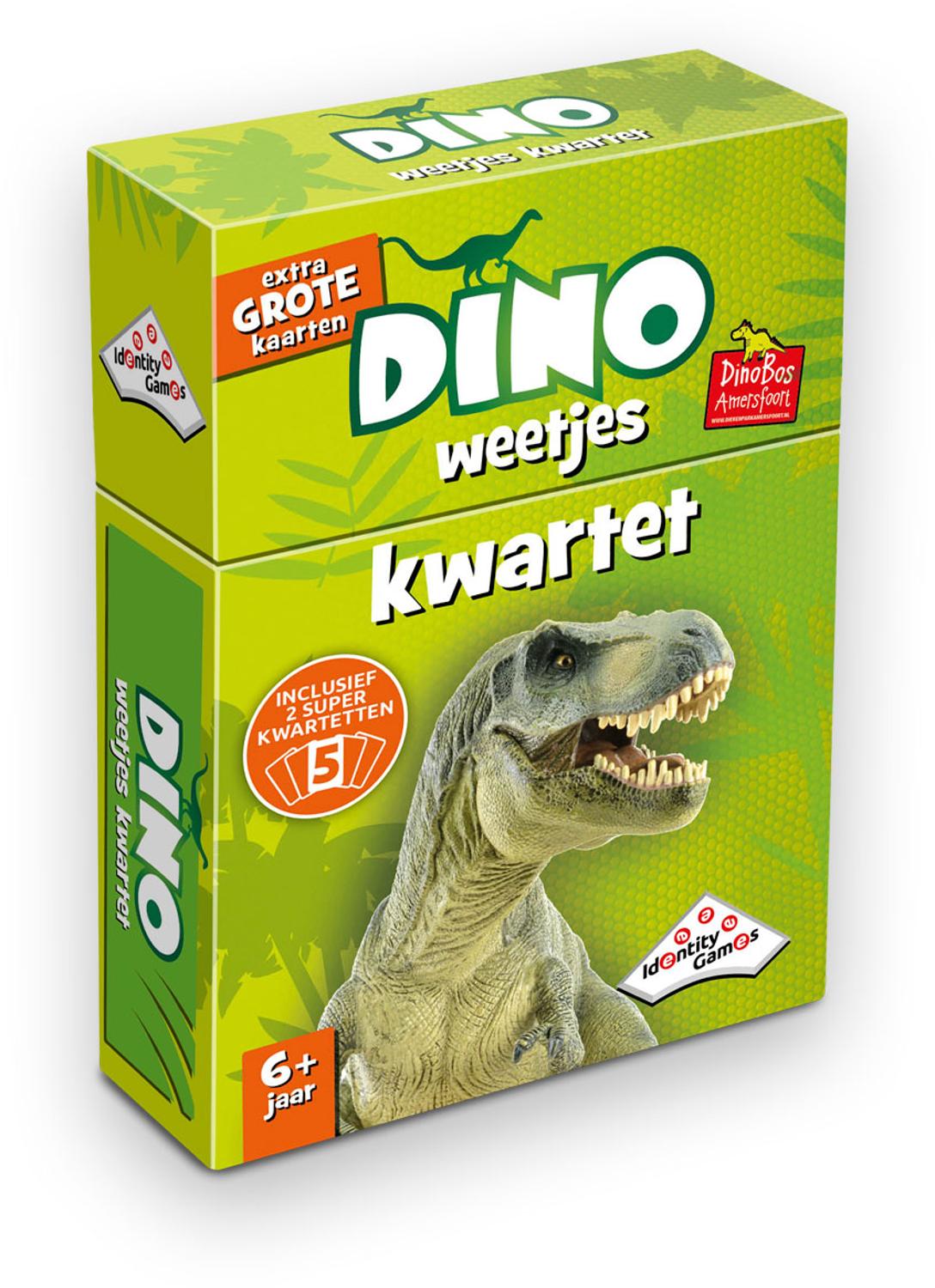 Identity Games, Dino weetjes kwartet. Kwartetten, een oer-Hollands kaartspel waarin steeds 4 kaarten bij elkaar gespaard worden. Kwartet! Nu over dino's, afgebeeld op extra grote kaarten. Op deze kaarten staan foto's en ook nog eens interessante weetjes! Inclusief een superkwartet van 5 kaarten. In de doos: 38 extra grote speelkaarten, spelregels. Geschikt voor 2 tot 4 spelers vanaf 6 jaar.