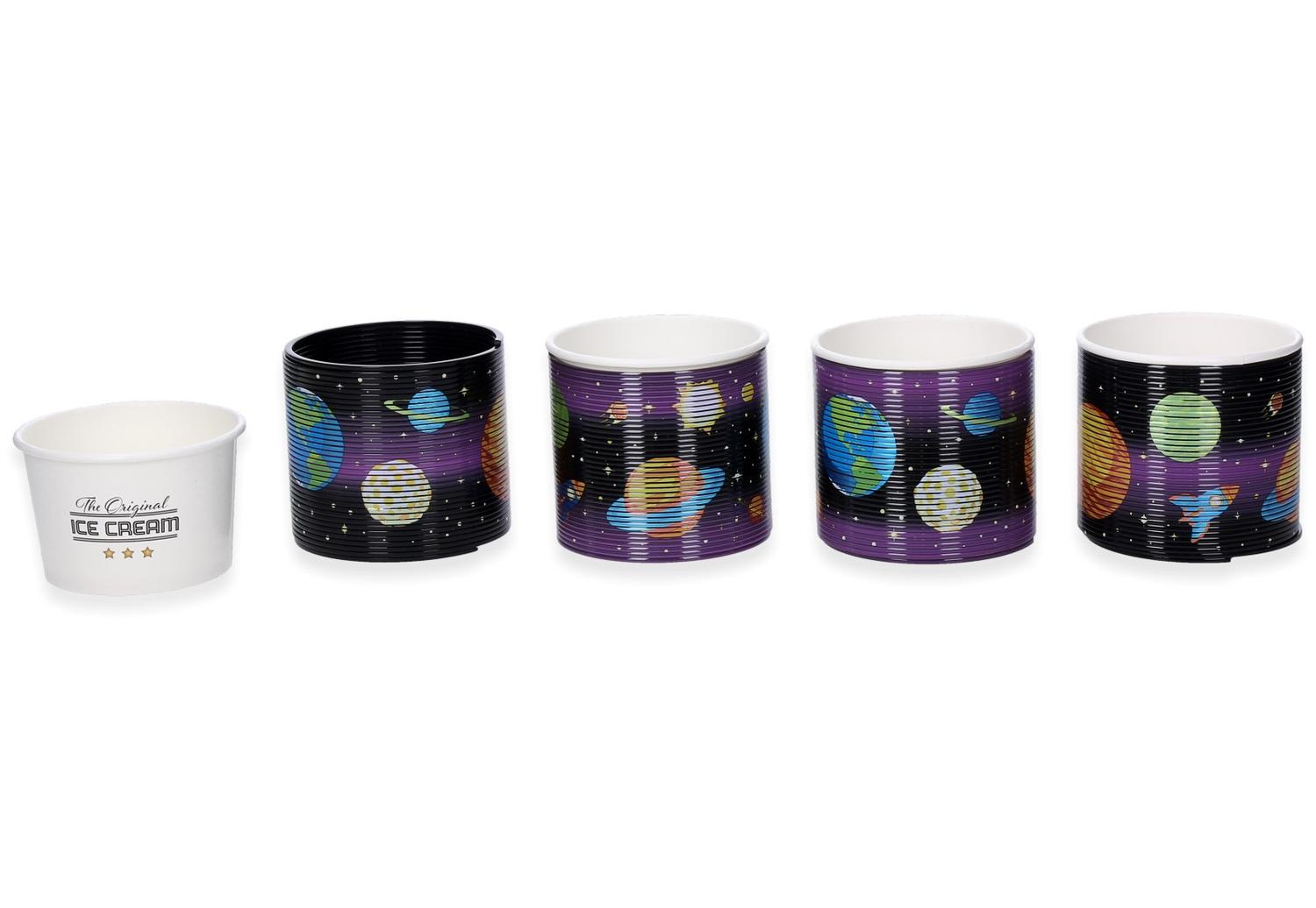 Met deze leuke trapveer die versierd is met afbeeldingen van planeten, sterren en raketten maak je ieder kind blij. Met een ijsbeker die in de trapveer past, is dit een unieke manier om een ijsje uit te delen. Wanneer de ijs op is kan het kind met de trapveer spelen.