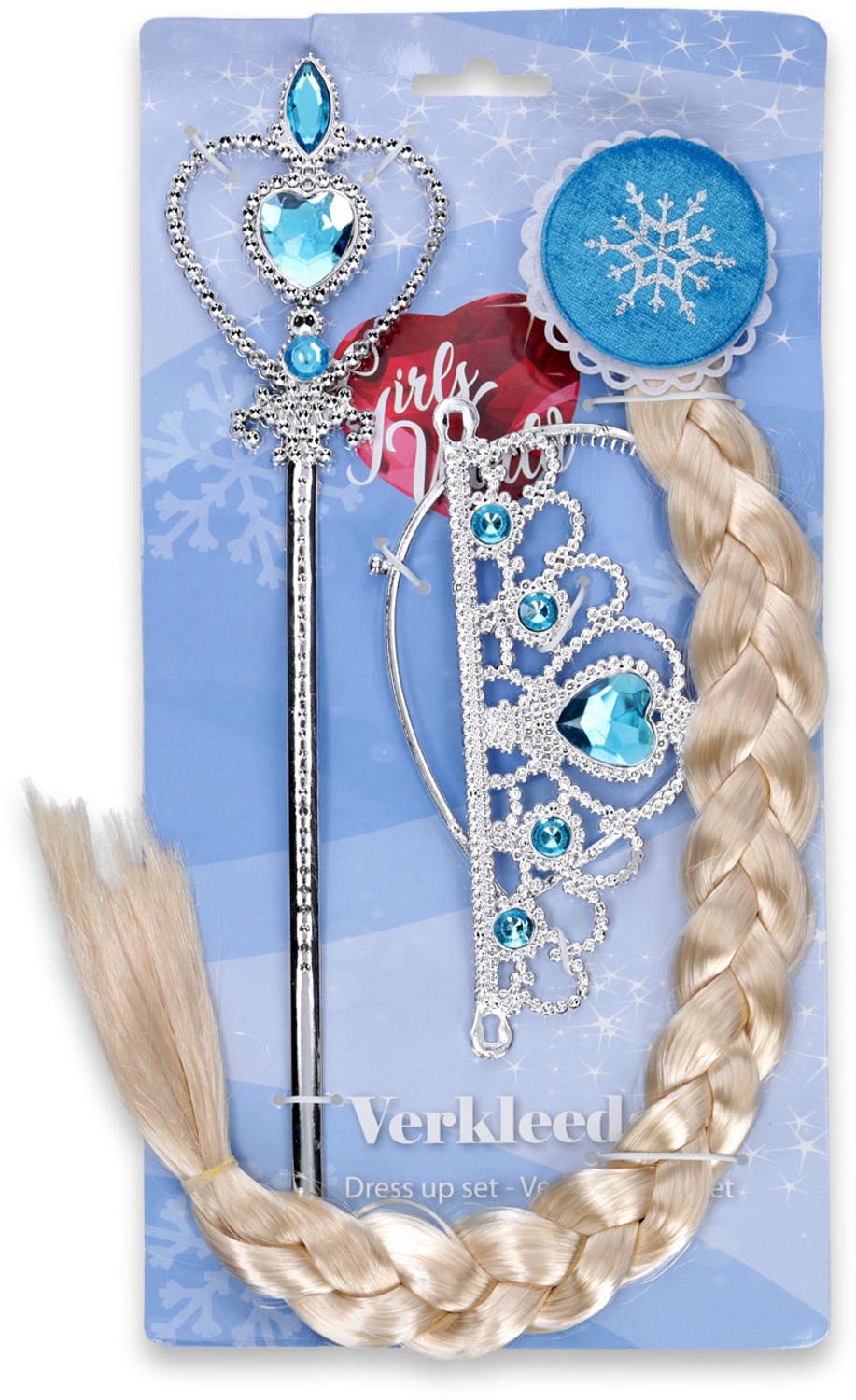 Een verkleedset voor de echte ijsprinses: met een diadeem/kroontje, een staf met diamanten en een mooie, blonde vlecht die je in je eigen haar kan bevestigen met een clip.