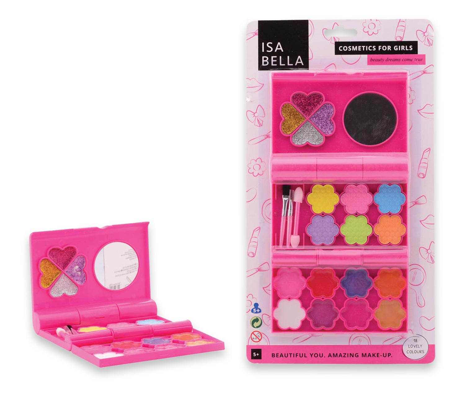 Maak je op met deze Isabella Make-up Box met spiegel. In de set vind je 6 verschillende kleuren oogschaduw en 12 verschillende kleuren lipgloss en 3 make-up kwastjes. Klap de make-up box dicht en neem hem overal mee naartoe.