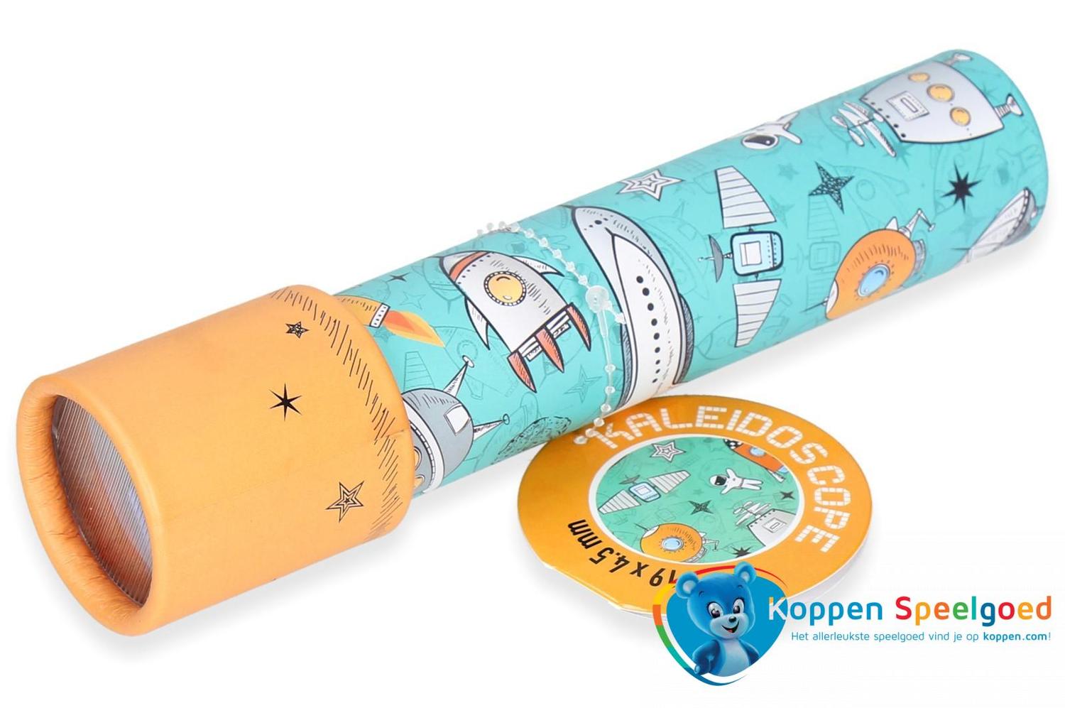 Deze kaleidoscoop heeft een print in ruimte thema. Kijk door de kaleidoscoop naar een lichtbron of de lucht en draai langzaam aan de ring. Je ziet fantastische patronen ontstaan!