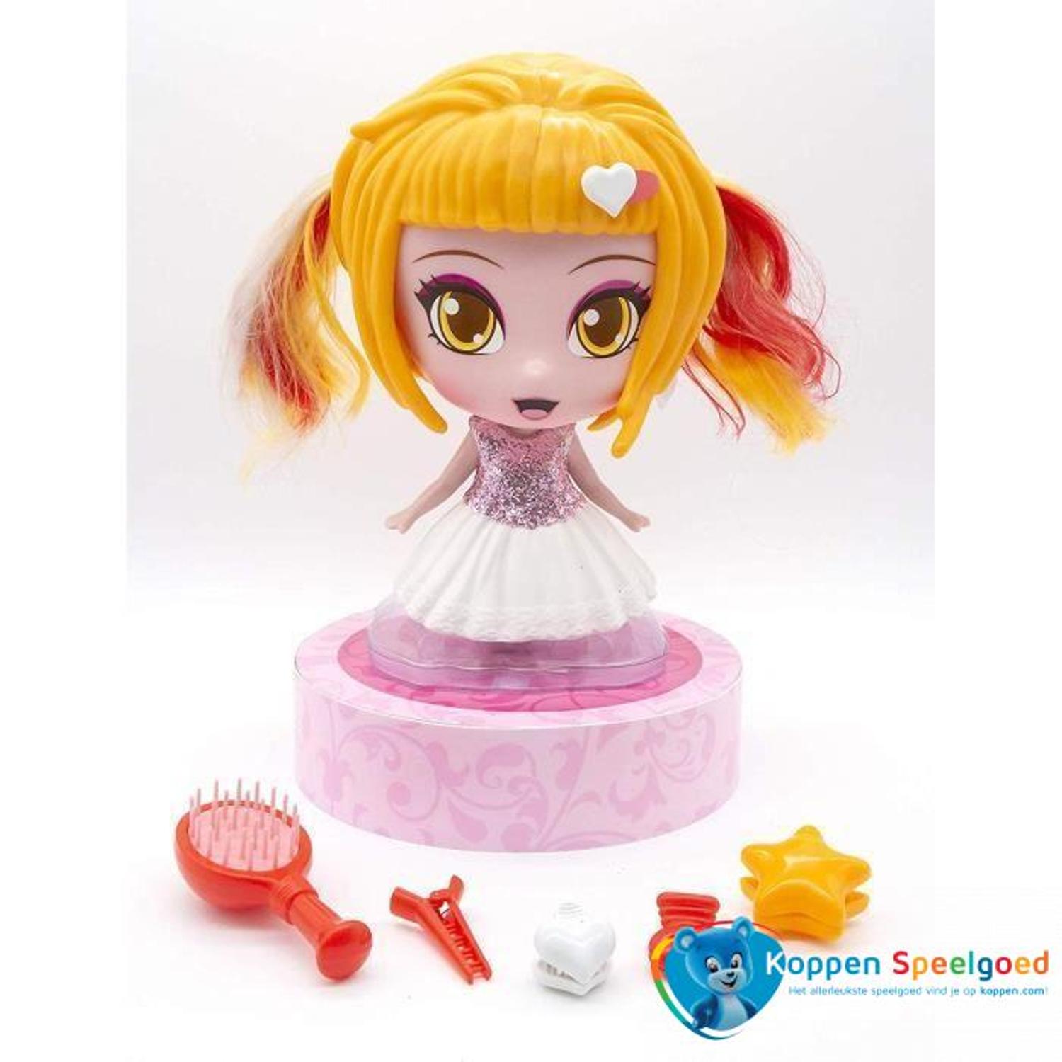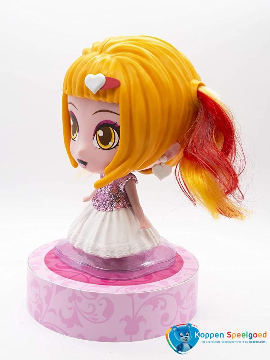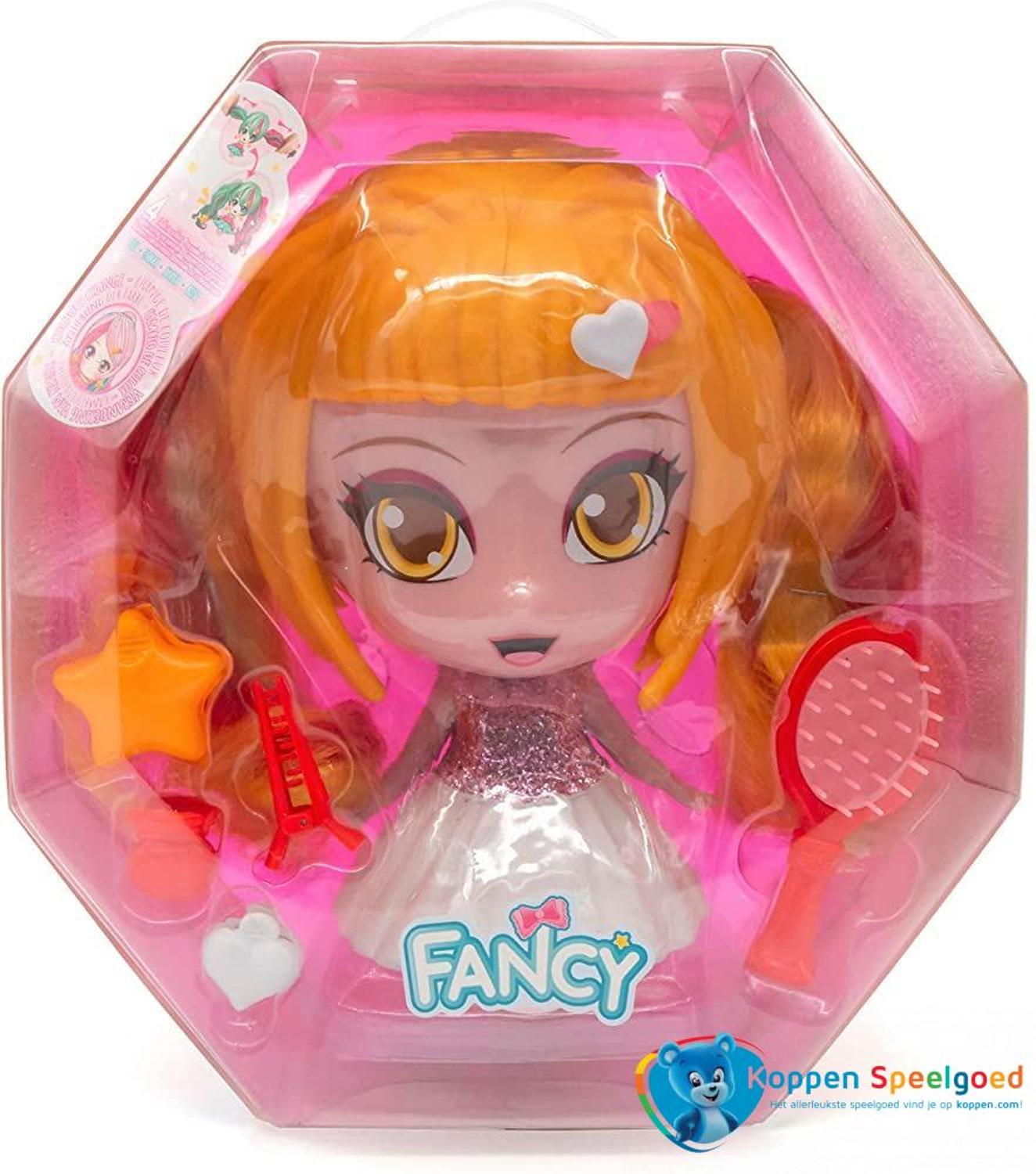 Fancy is hét meisjesachtige fenomeen! Haar haar is ultra gekleurd, ruikt goed en is magisch! Trek aan haar paardenstaart om het langer te maken. Je kunt vervolgens haar super trendy kapsels maken met alle accessoires inbegrepen. Haar oogleden veranderen van kleur bij contact met warm water. Zo mooi, zo fancy!