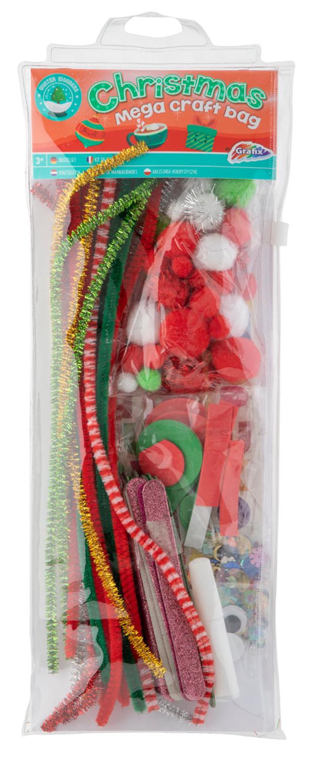 Knutselmateriaal voor Kerst. Met o.a. ragers, glitters, sneeuwvlokken, wiebeloogjes, foam en pom-pons. In hersluitbaar etui.