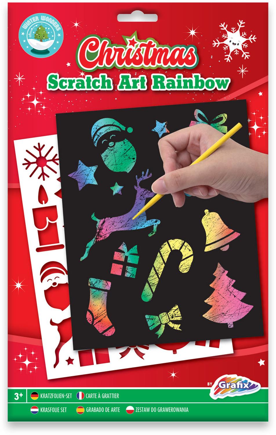 Krasplezier gegarandeerd met de meegeleverde kraspen, door te krassen komen de meest fantastische kleuren naar boven. Door de meegeleverde mal kan je de leukste kerst gerelateerde figuren tevoorschijn krassen. Bevat 4 kraskaarten, een kraspen, een mal met figuren en 4 houders voor de kaarten om ze mooi neer te kunnen zetten.