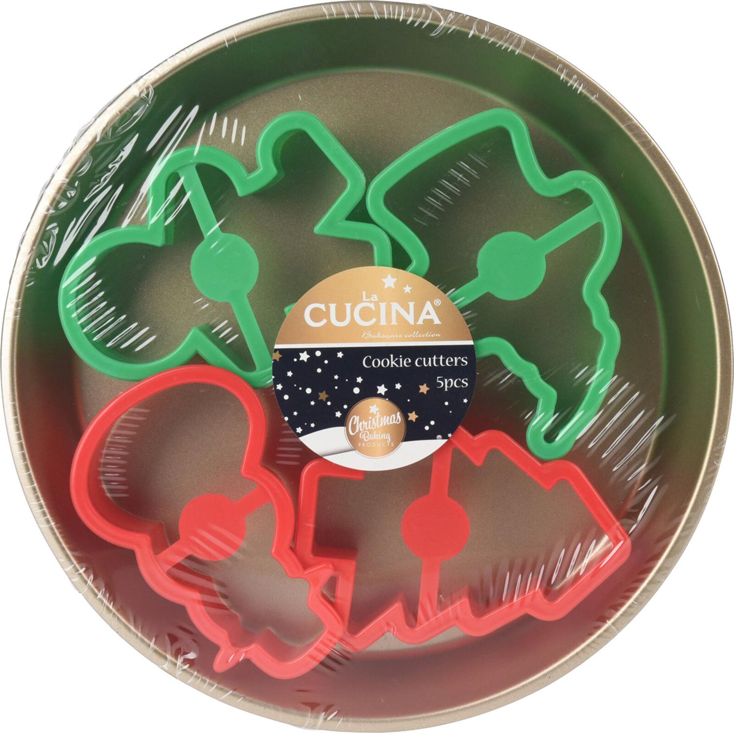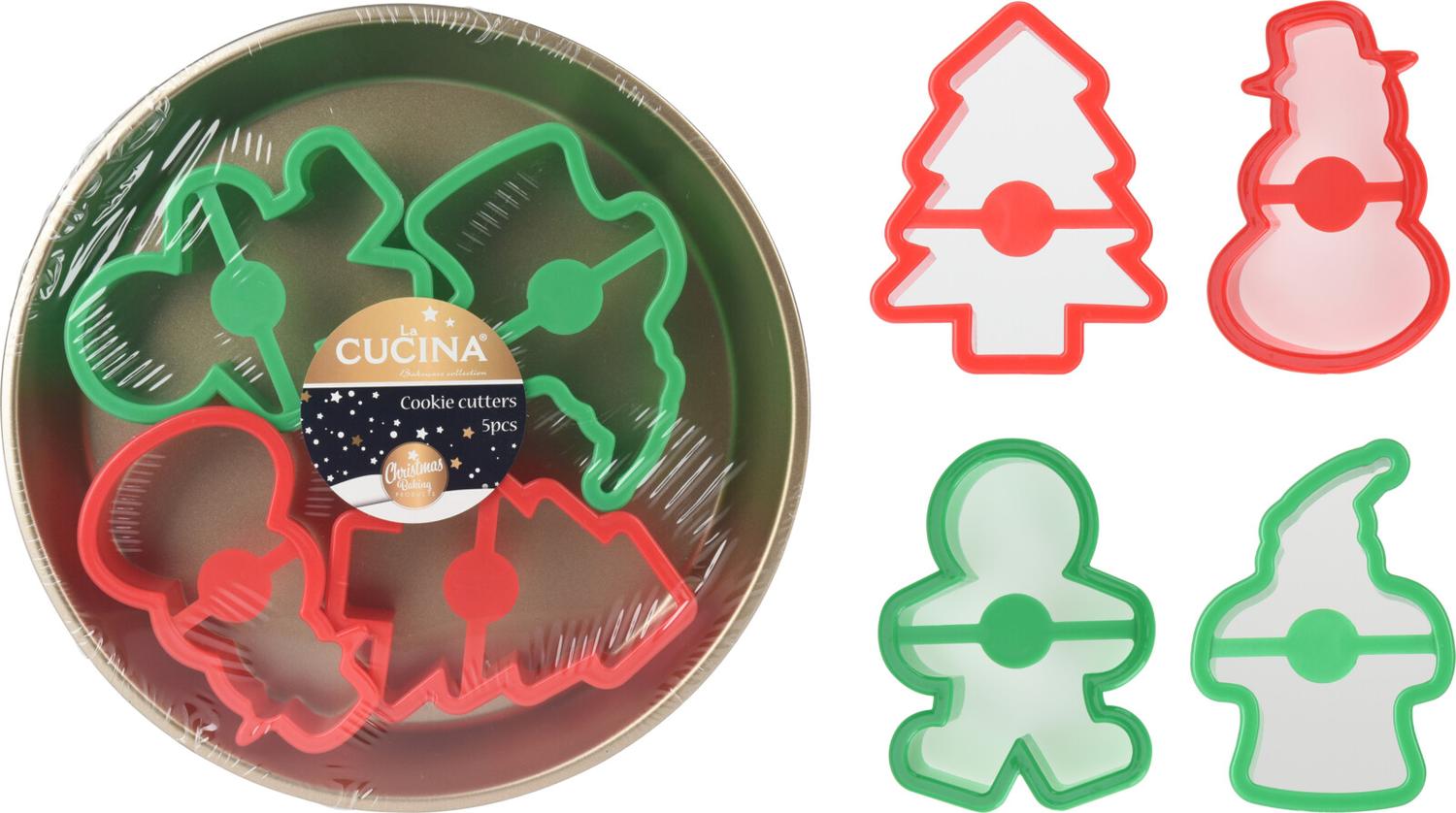 Voor Kerstmis: 4 uitsteekvormen en een bakblik. Het bakblik is van metaal, de vormpjes van kunststof.