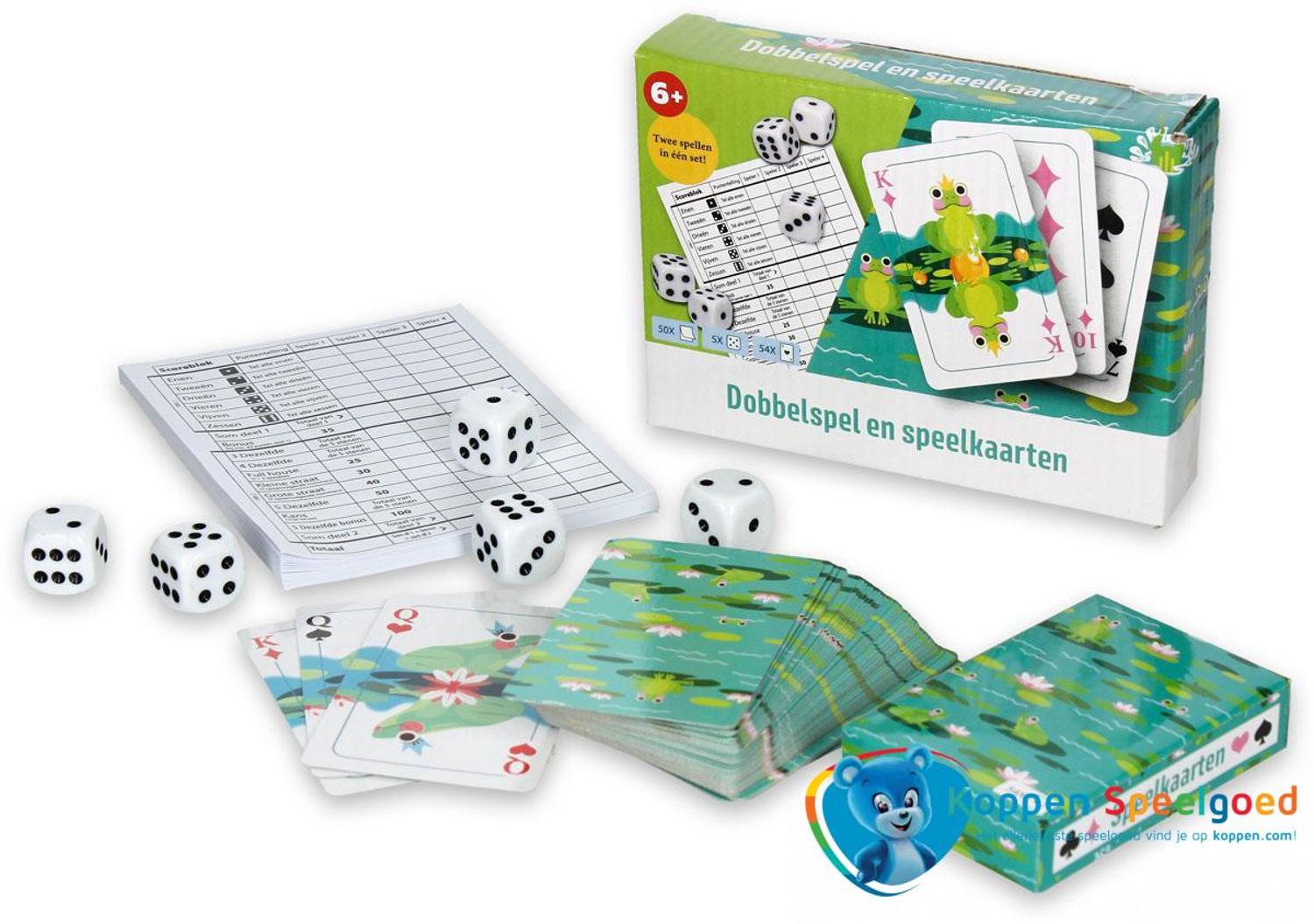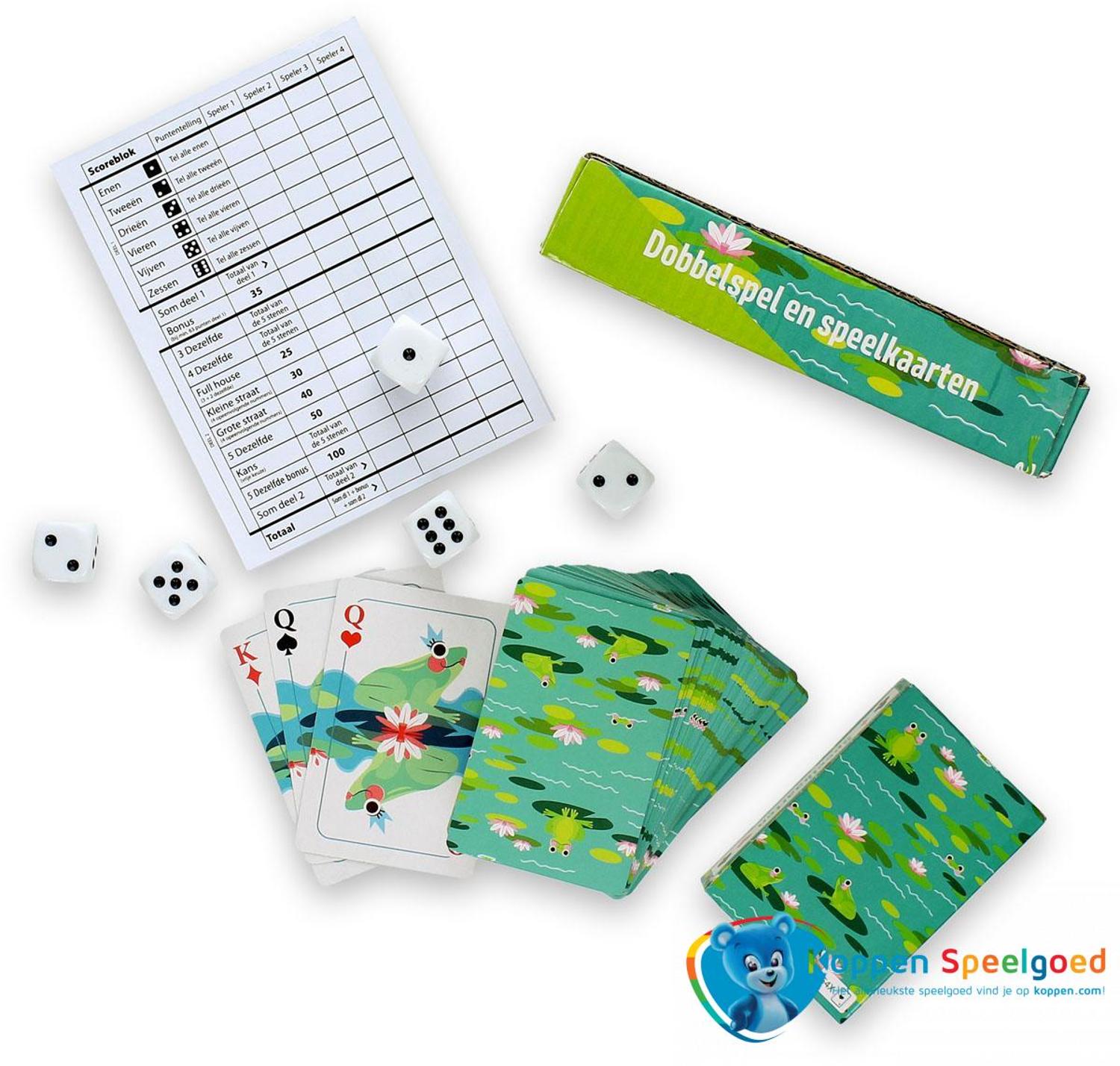Deze set is twee spellen in een. Prachtig kaartspel met speelkaarten van kikkers, plus een dobbelspel met scoreblok van 50 vel. Geschikt om te spelen met kinderen vanaf 6 jaar. De spelregels staan achterop het scoreblok. Met scoreblok van 50 vel en 5 dobbelstenen.