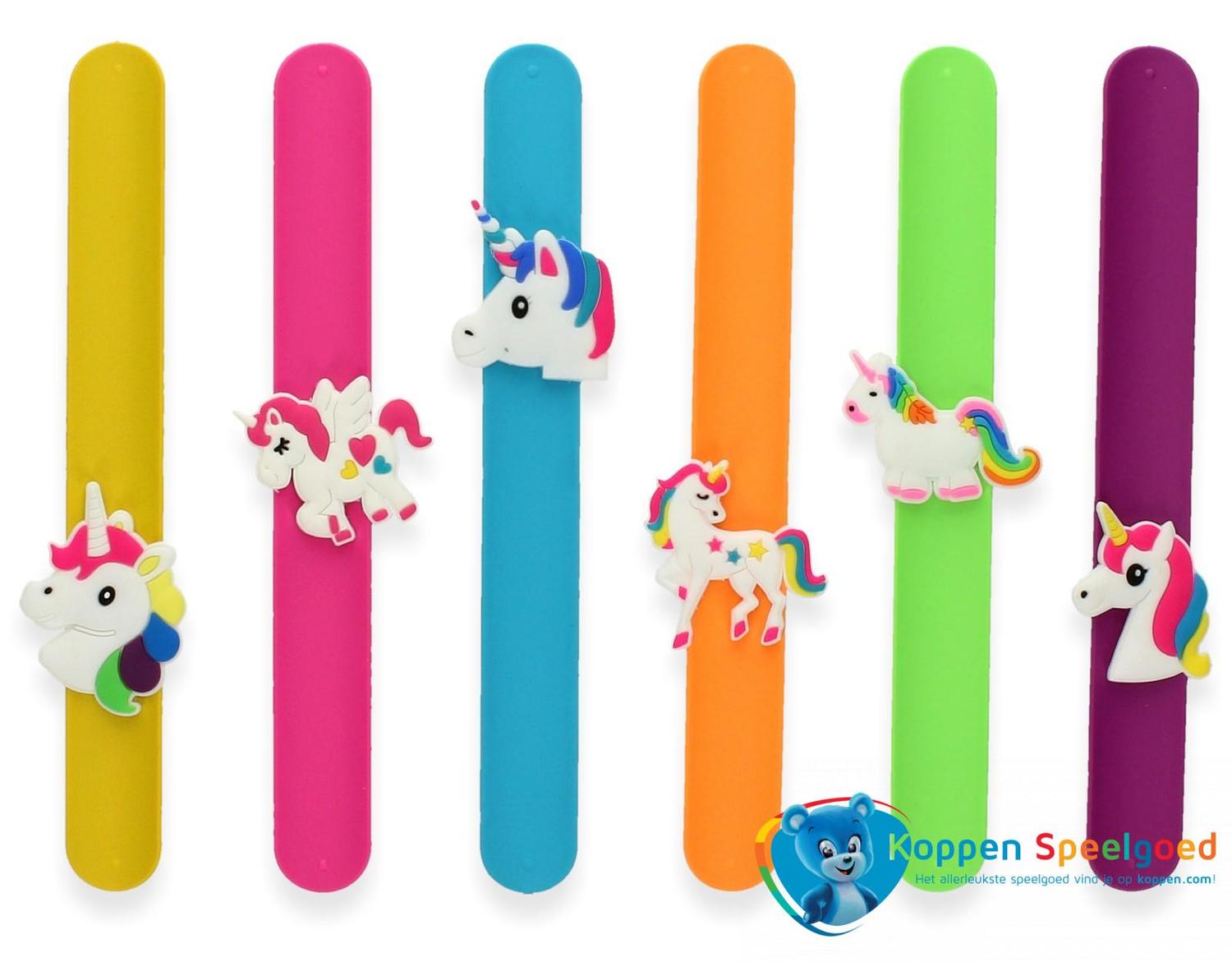 Klaparmband eenhoorn. Een roze of paarse klaparmband die 21,5 cm lang is. Uitgerust met eenhoorn. Geschikt voor kinderen vanaf drie jaar. Ook leuk voor in de grabbelton.