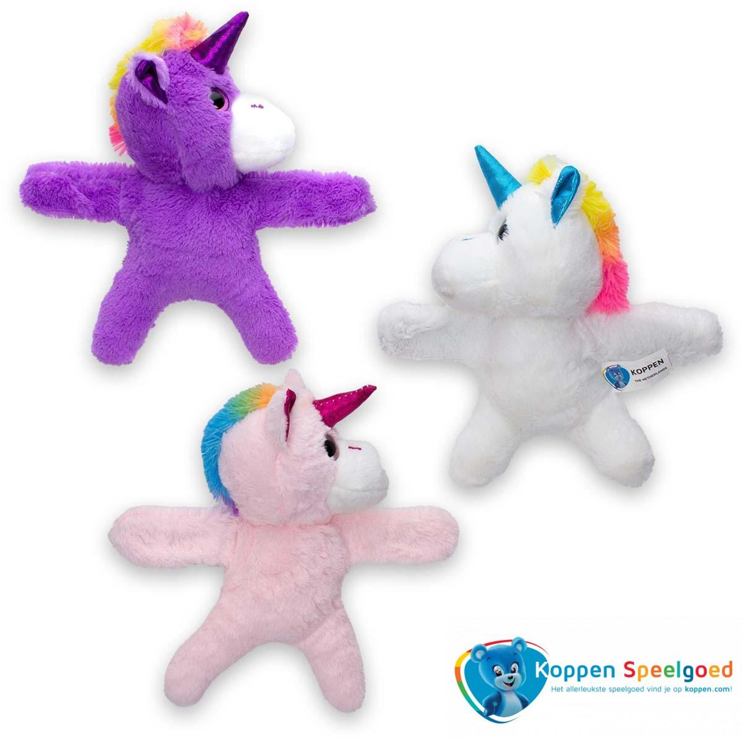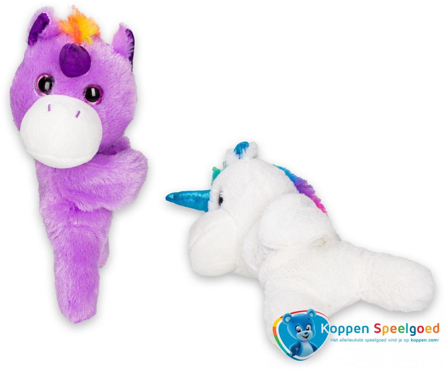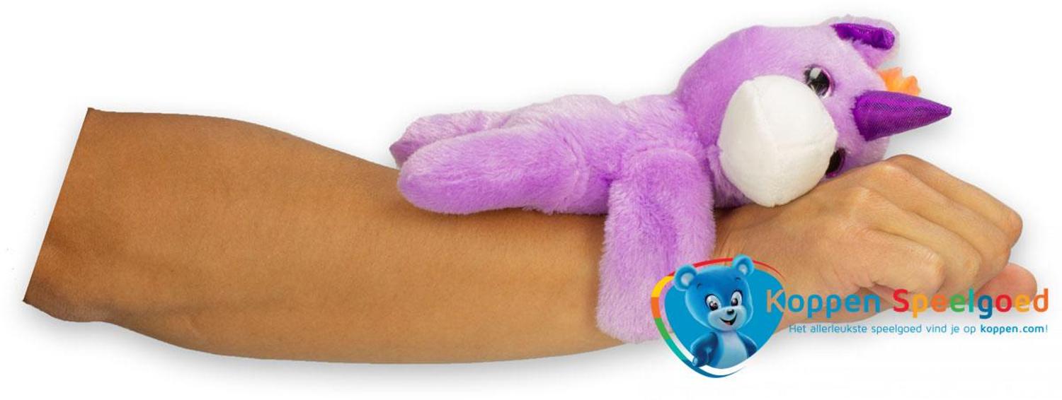Een klaparmband in de vorm van een eenhoorn die heel graag met je arm wil knuffelen. Tik het dier met opengeklapte armen tegen je eigen arm en zijn armen klappen om jouw arm heen.