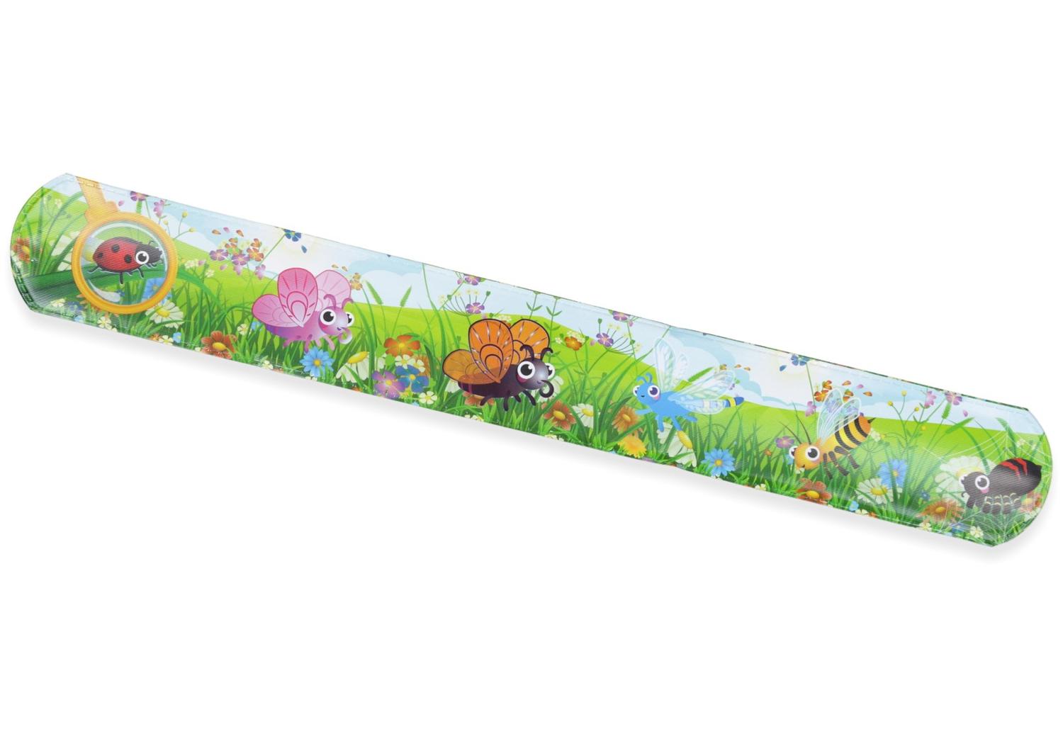 Klaparmband insecten. Een klaparmband met een insecten print. Sla de rechte armband tegen je pols en hij klapt om je arm. Geschikt voor kinderen vanaf drie jaar. Leuk cadeau voor in de grabbelton.