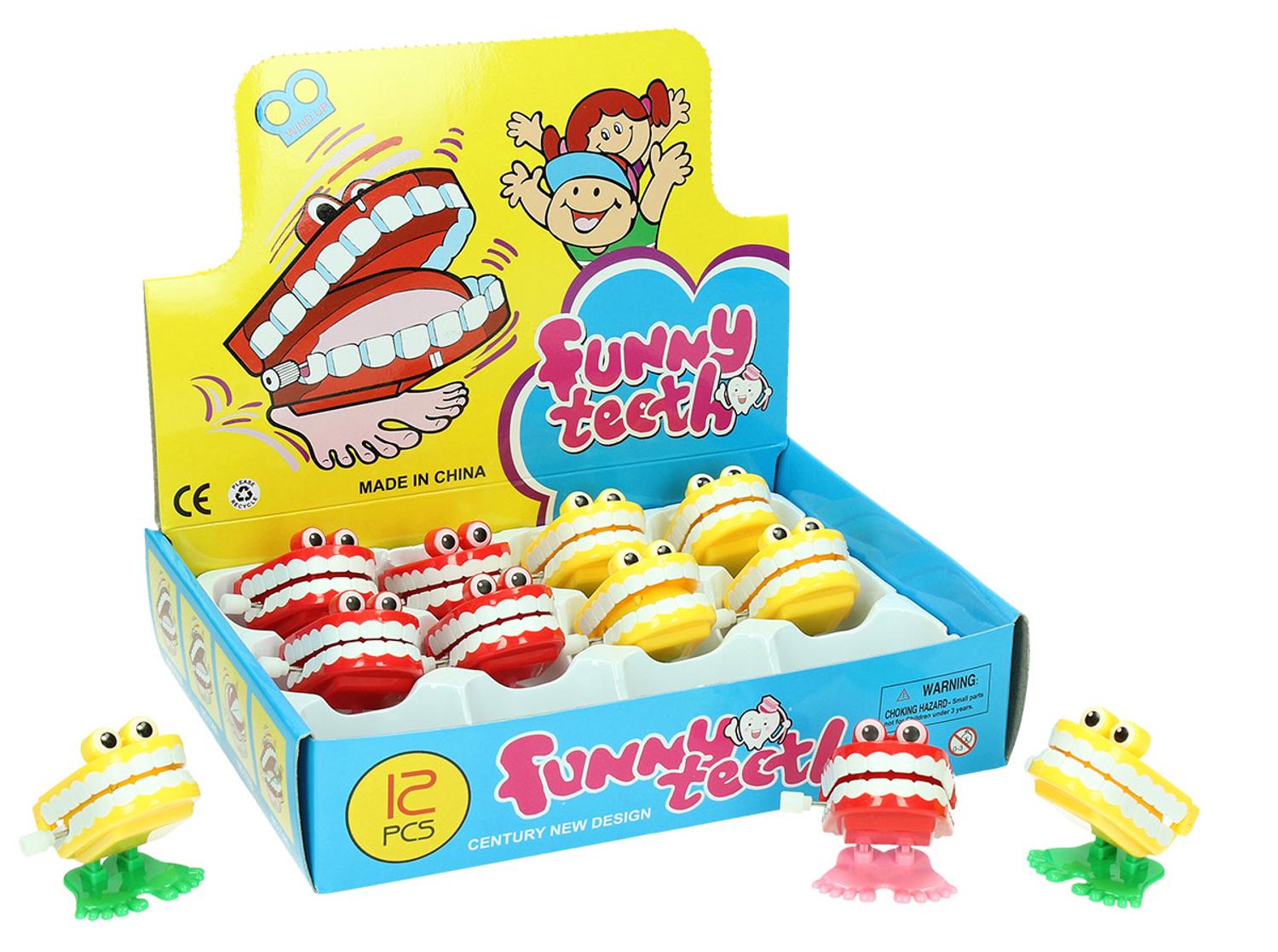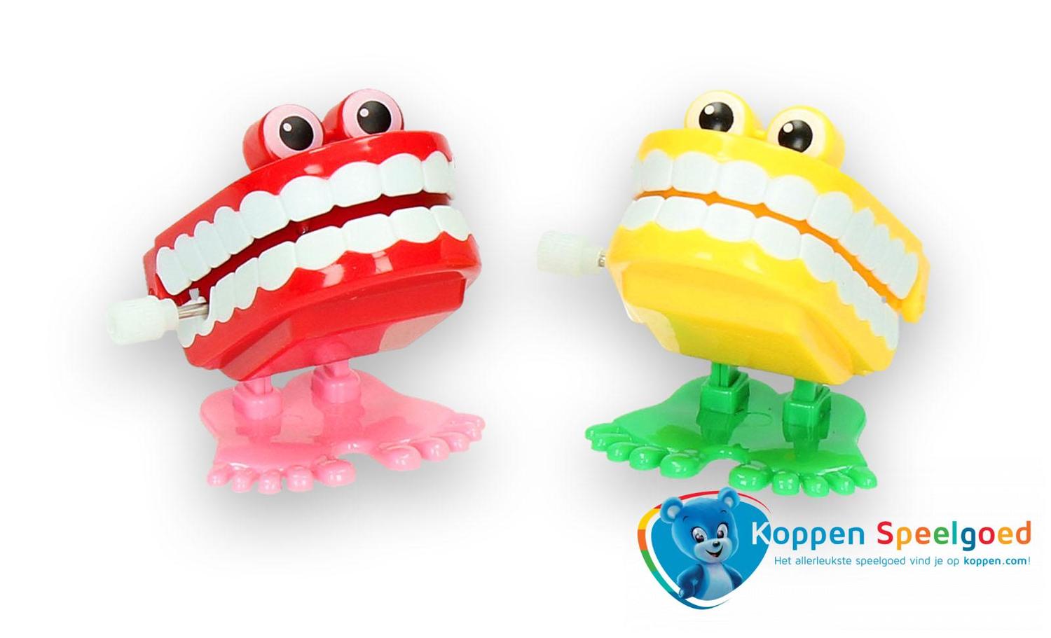 Klapperende opdraai tanden. Draai de tanden op en de tanden lopen klapperend aan. Leuk cadeau voor in de grabbelton. Geschikt voor kinderen vanaf drie jaar. De verschillende kleuren worden door elkaar geleverd.