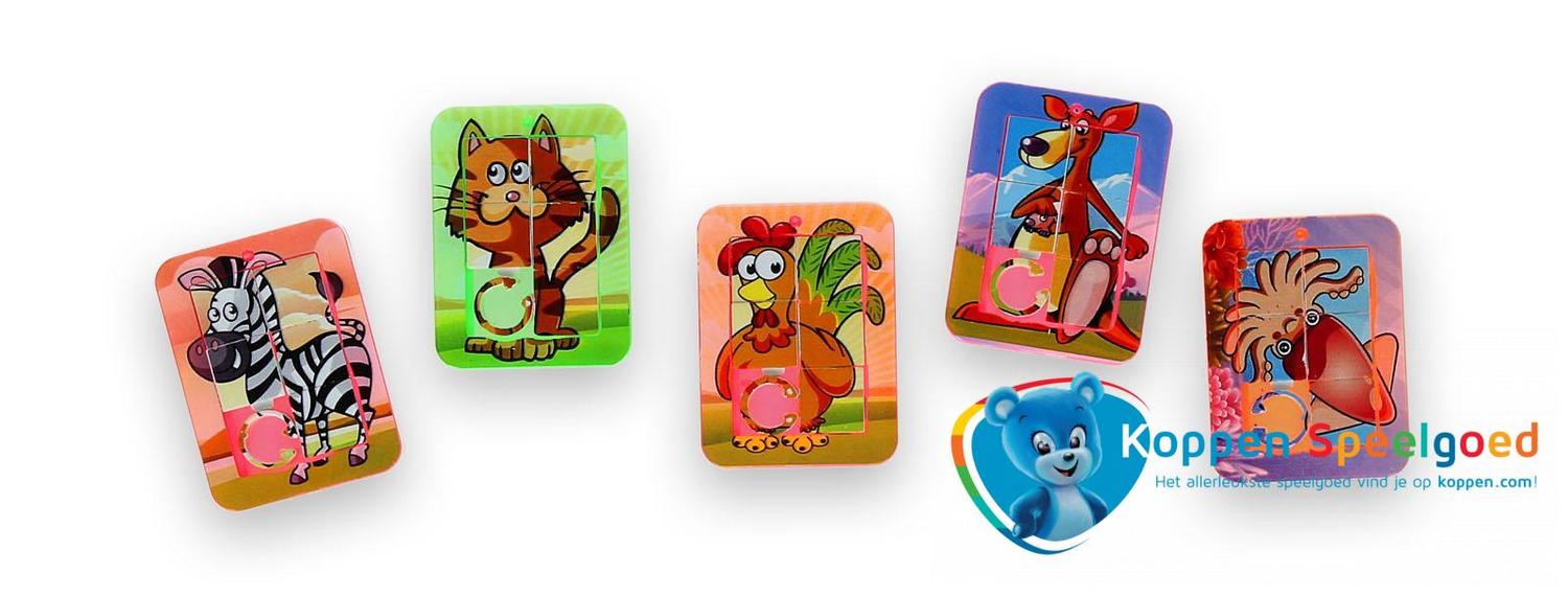 Kleine schuifpuzzel dieren. Verschillende schuifpuzzels met een dierenprint. Leuk cadeau voor in de grabbelton of als weggeef cadeau. Geschikt voor kinderen vanaf drie jaar. De verschillende puzzels worden door elkaar geleverd.